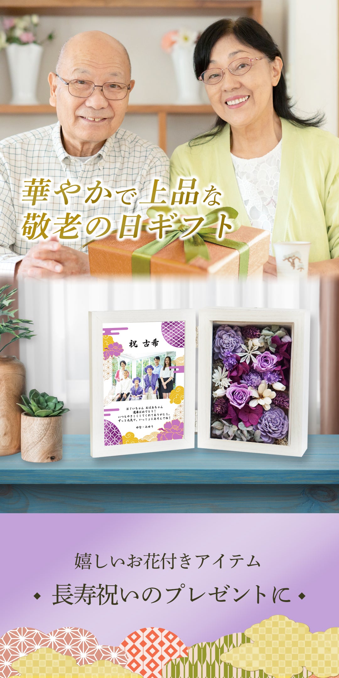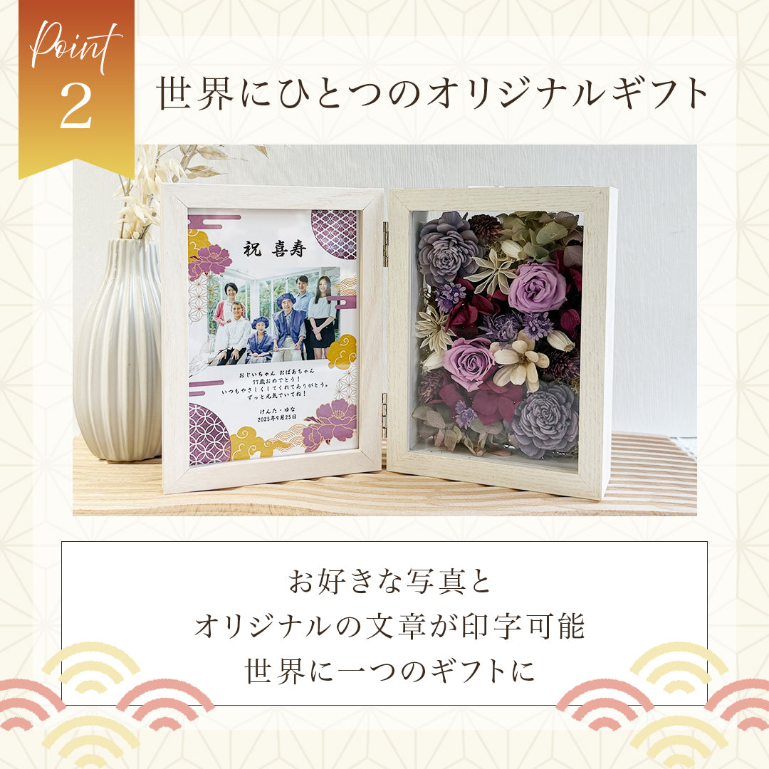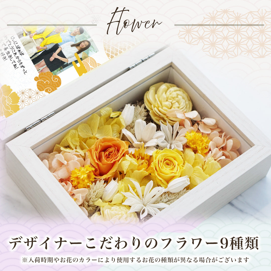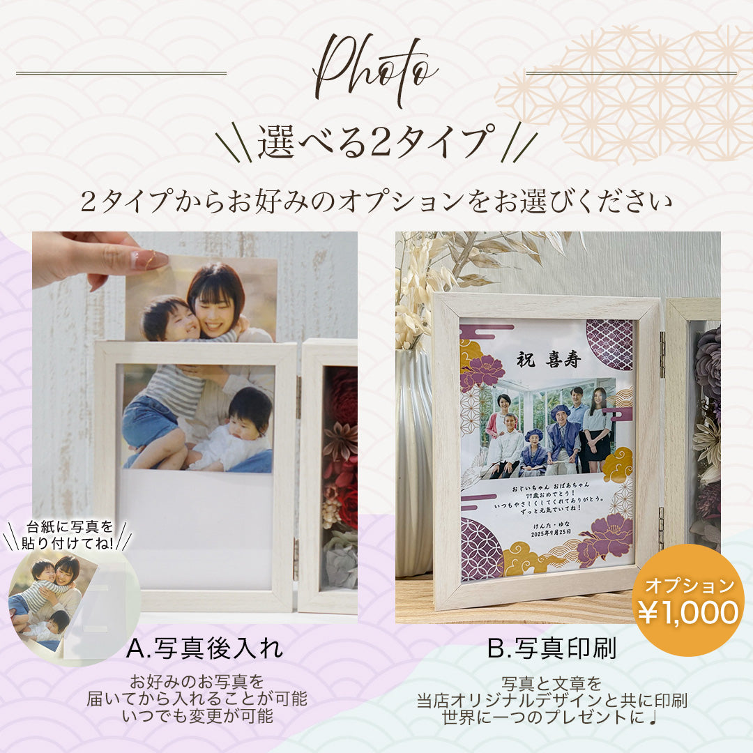 自然素材を使用したナチュラルなデザインで、日頃の感謝の気持ちを込めたお写真とフラワーのギフトは長寿のお祝いにぴったりです!