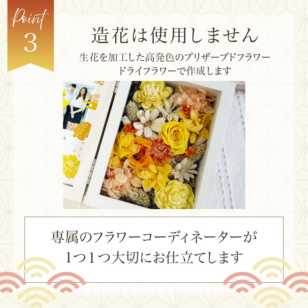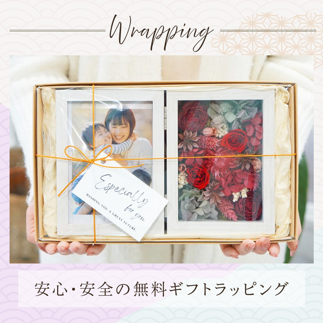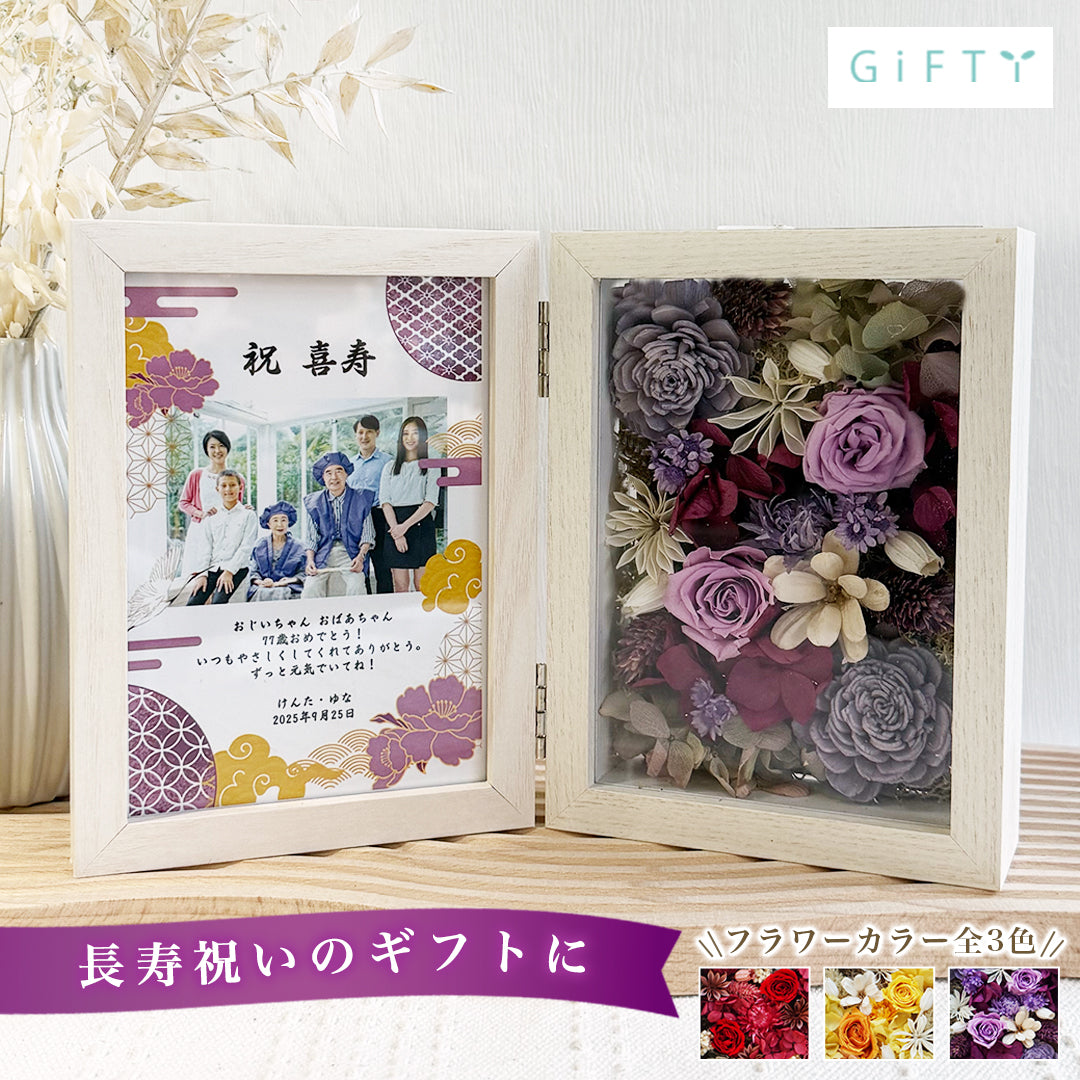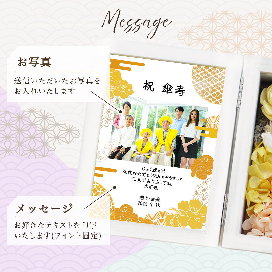 自然素材を使用したナチュラルなデザインで、日頃の感謝の気持ちを込めたお写真とフラワーのギフトは長寿のお祝いにぴったりです!
