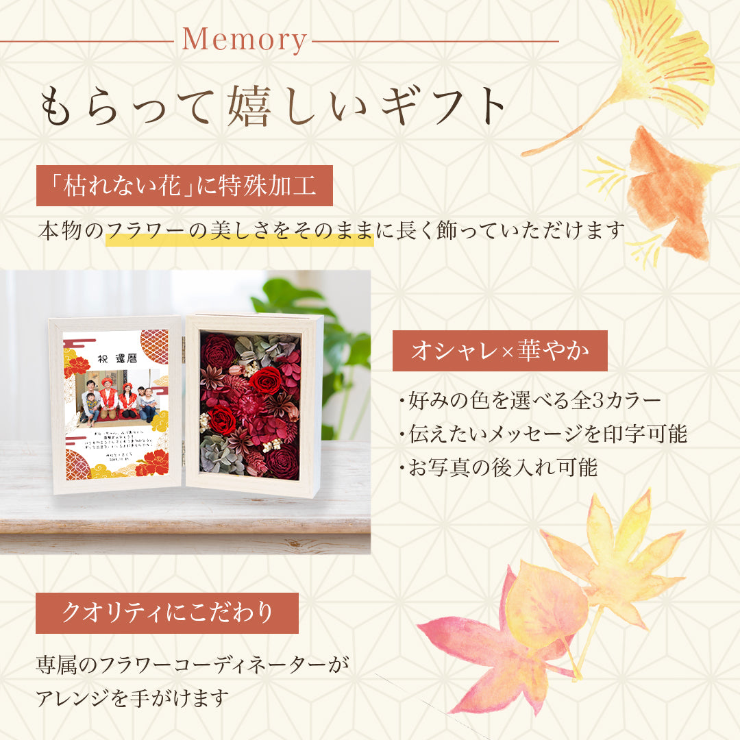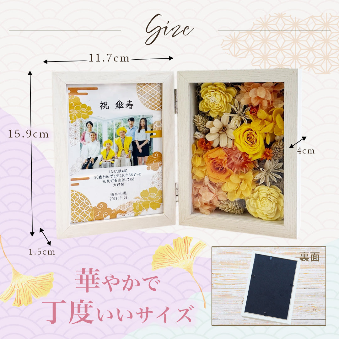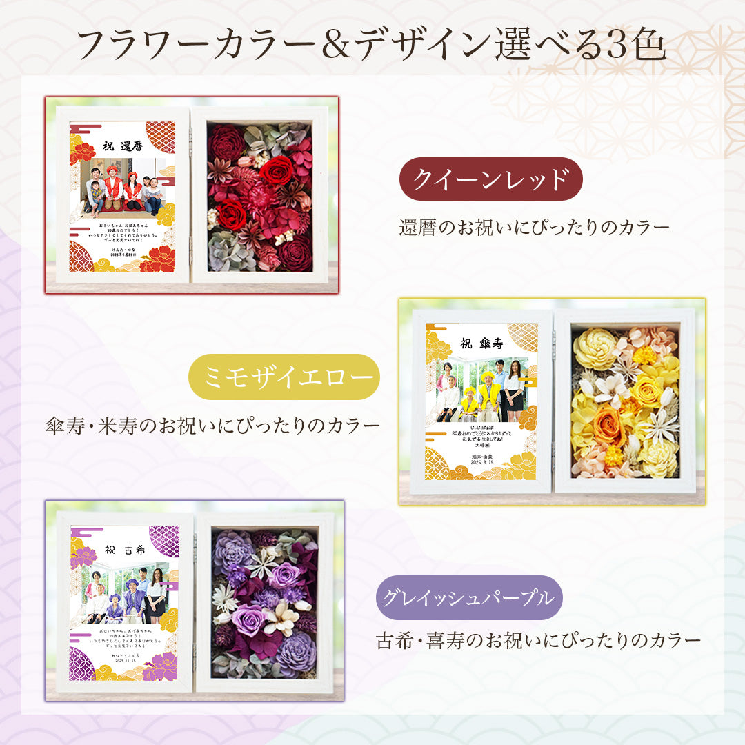 自然素材を使用したナチュラルなデザインで、日頃の感謝の気持ちを込めたお写真とフラワーのギフトは長寿のお祝いにぴったりです!