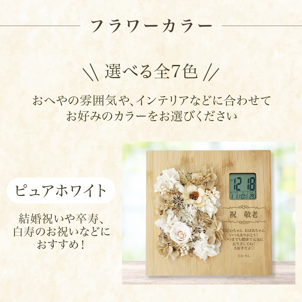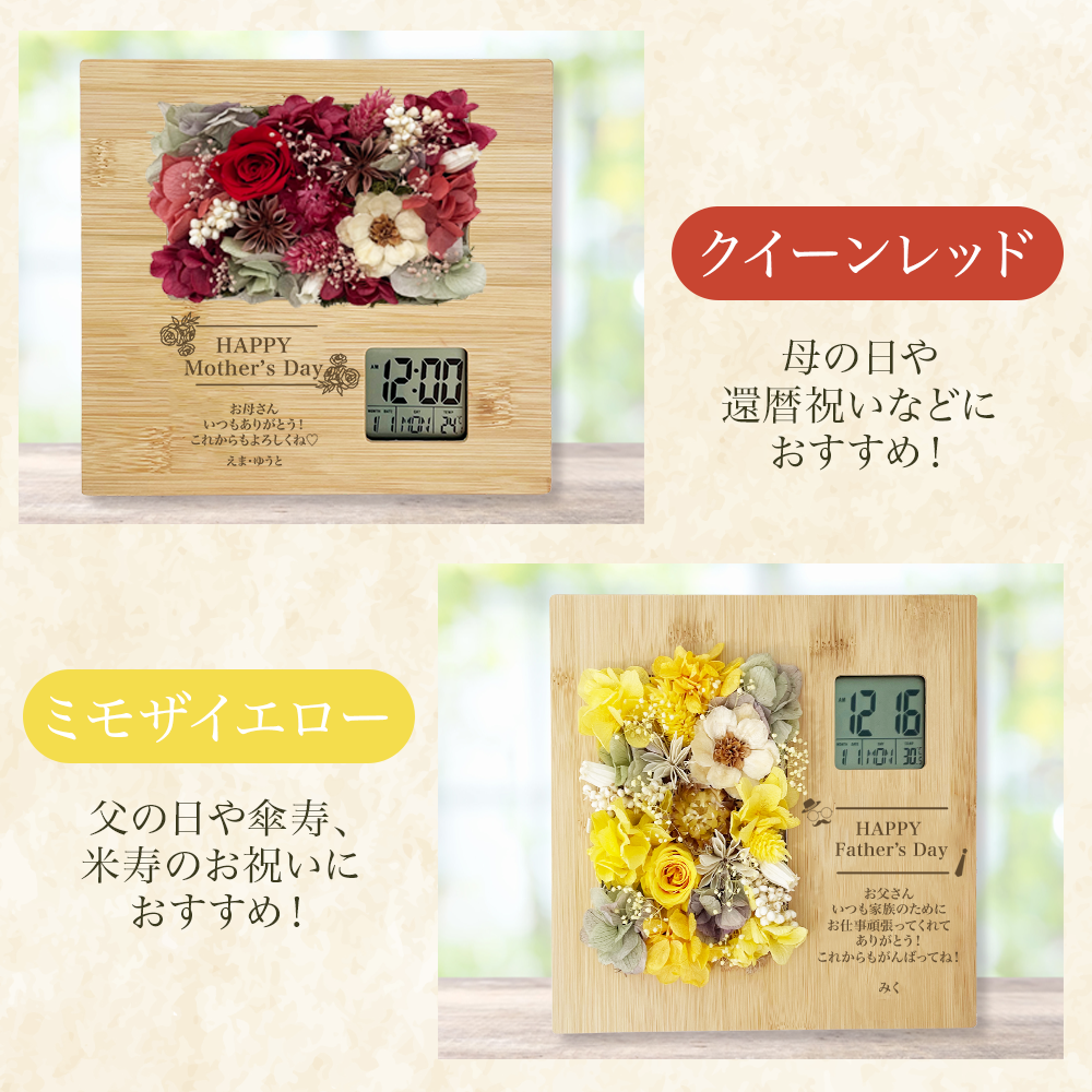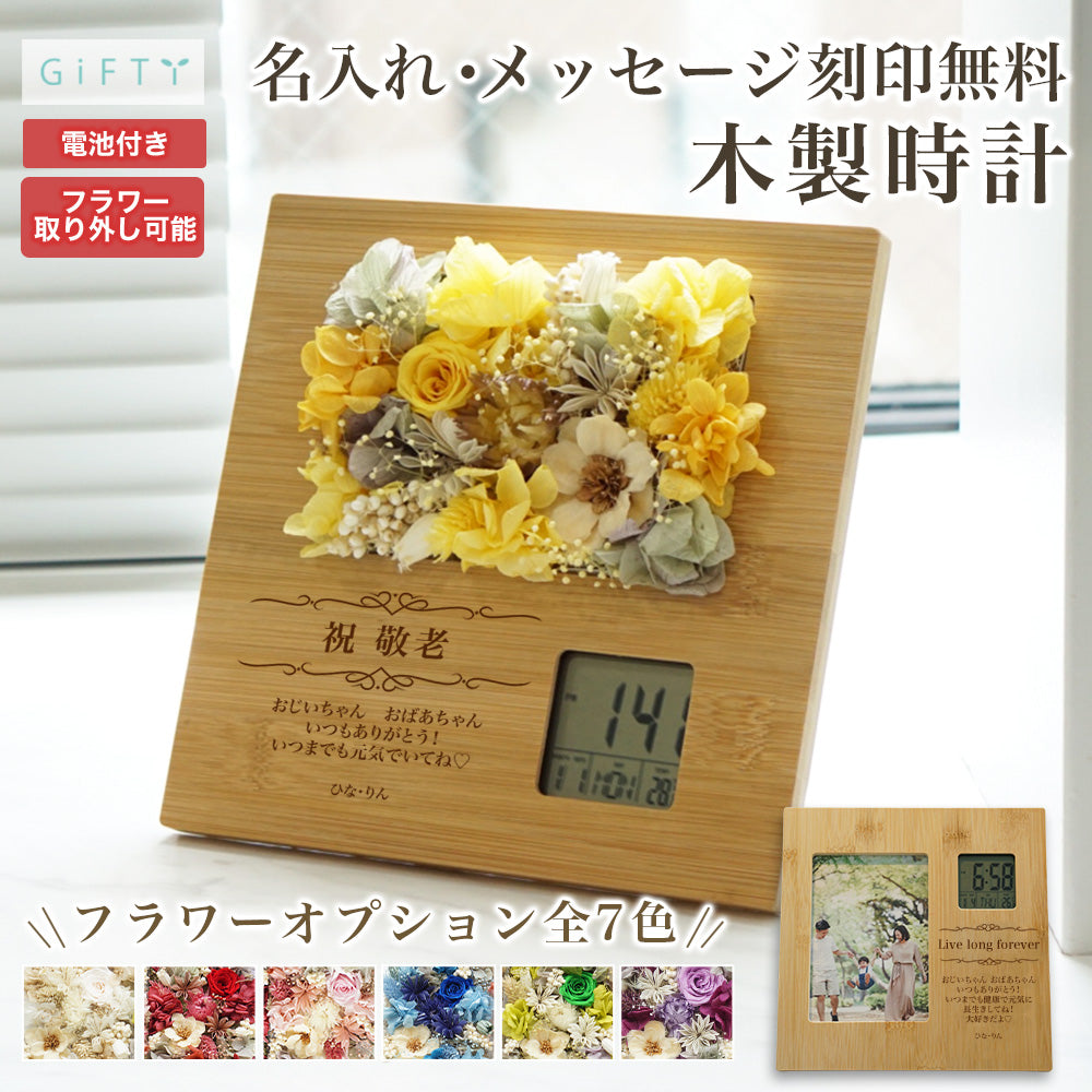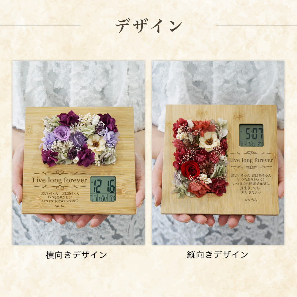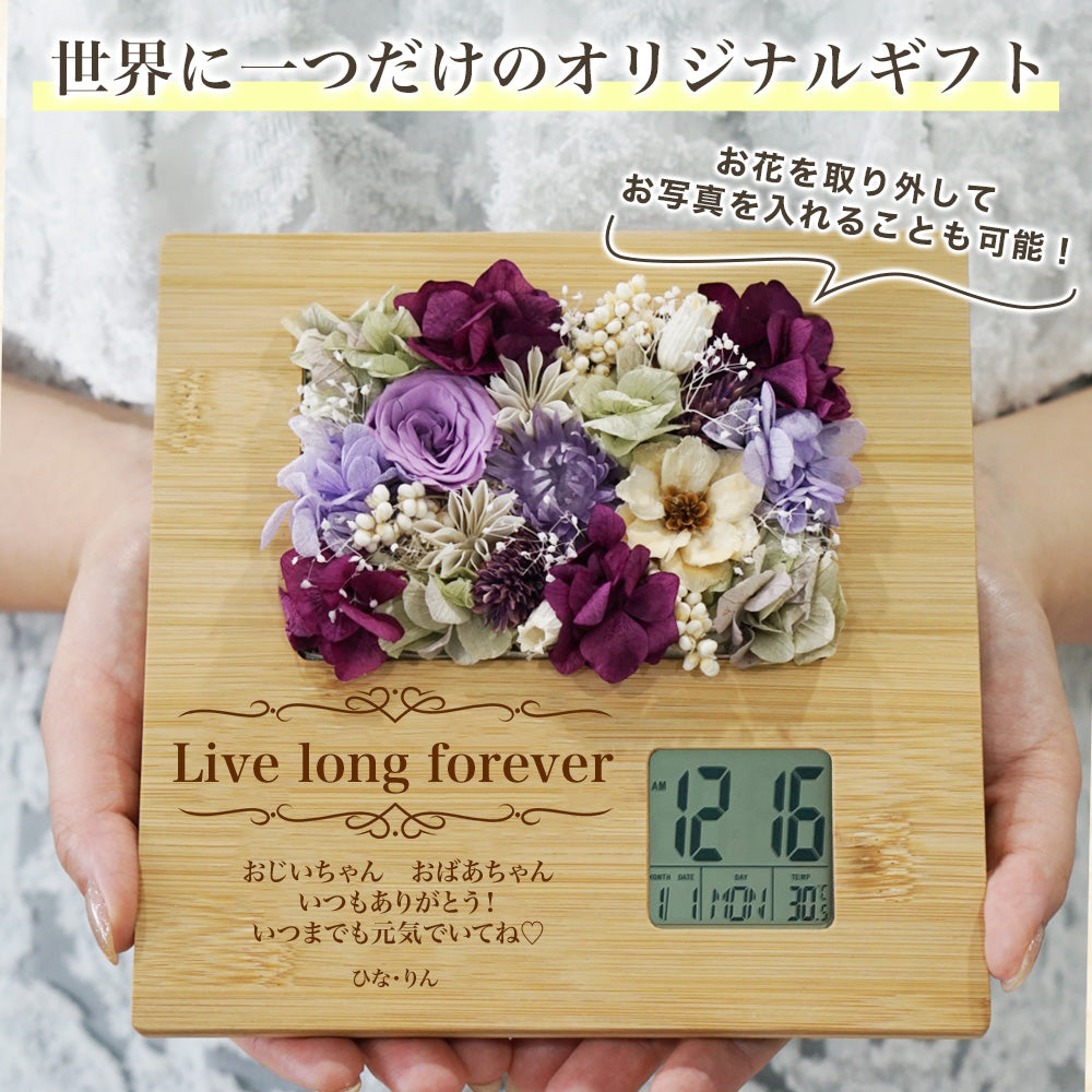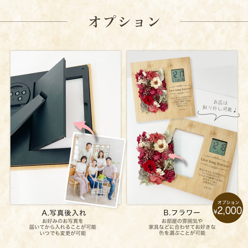 高品質な竹製の時計にお好きなメッセージを刻印し、写真やフラワーと合わせた世界に一つだけのオリジナル時計が作ります。 また写真後もありますので、お好きなお写真をお楽しみいただけます。 フラワーオプションはドライフラワーやプリザーブドフラワーの