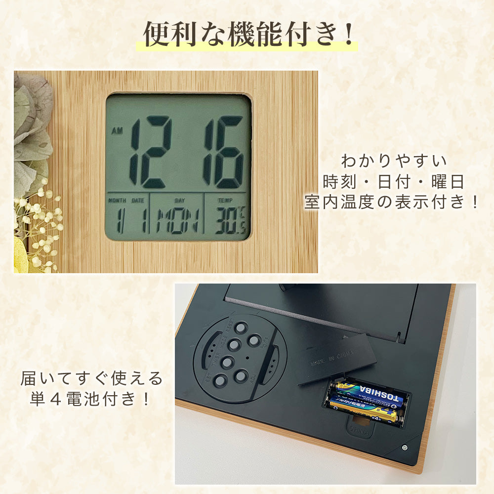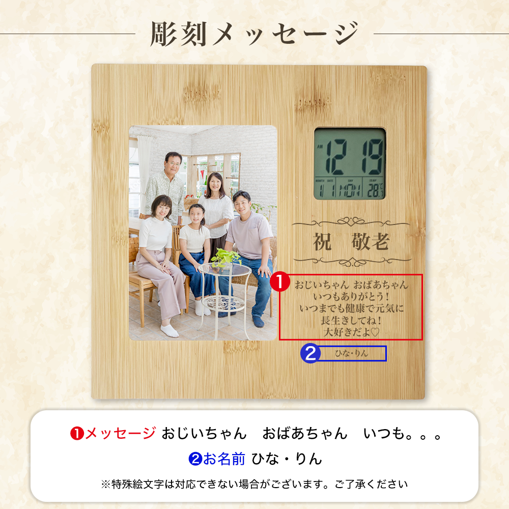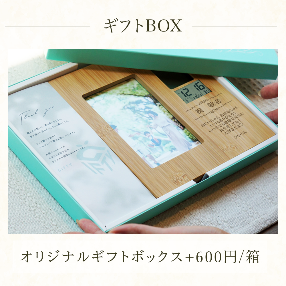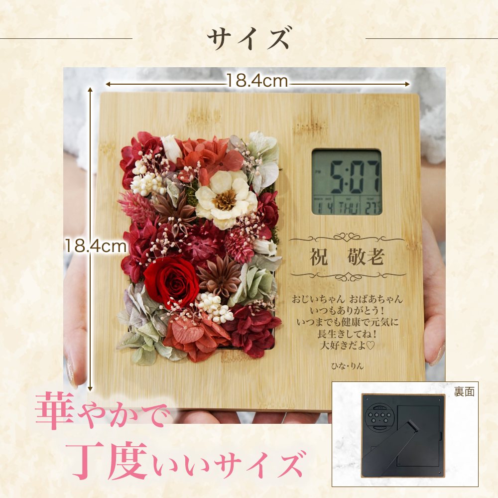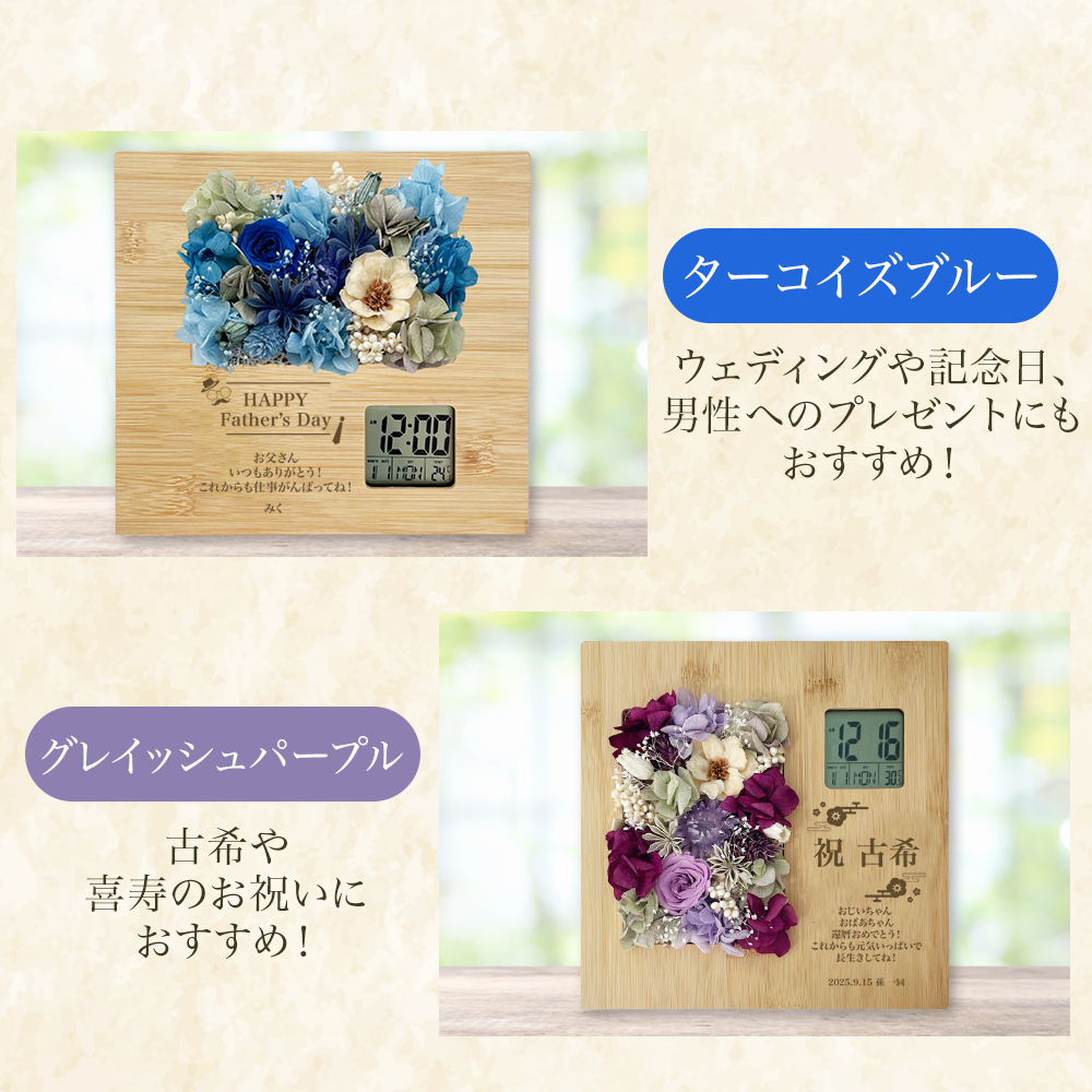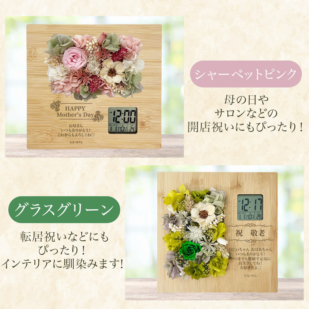 高品質な竹製の時計にお好きなメッセージを刻印し、写真やフラワーと合わせた世界に一つだけのオリジナル時計が作ります。 また写真後もありますので、お好きなお写真をお楽しみいただけます。 フラワーオプションはドライフラワーやプリザーブドフラワーの