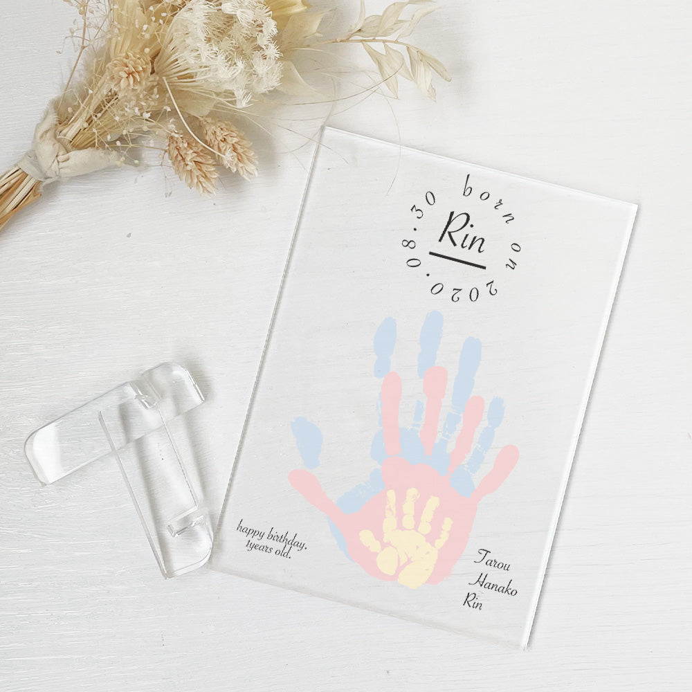 お母さん お父さん お子様 デザインの手形を重ねて作る世界に一つのアート作品。メッセージを組み合わせてプリントできます。アクリルの透明感がスタイリッシュで高級感のある定番人気商品です!