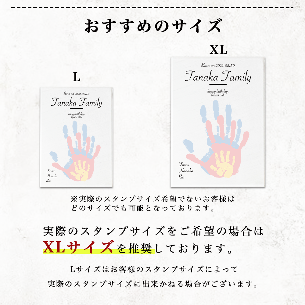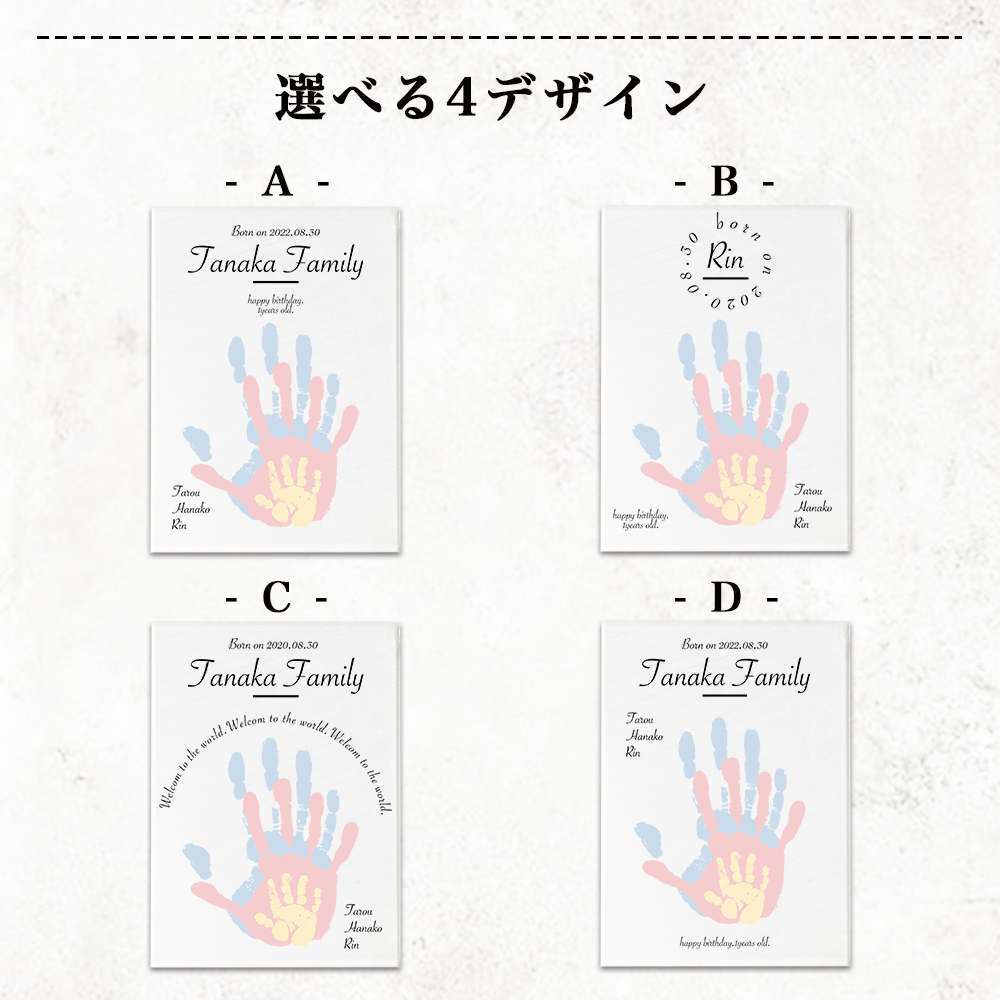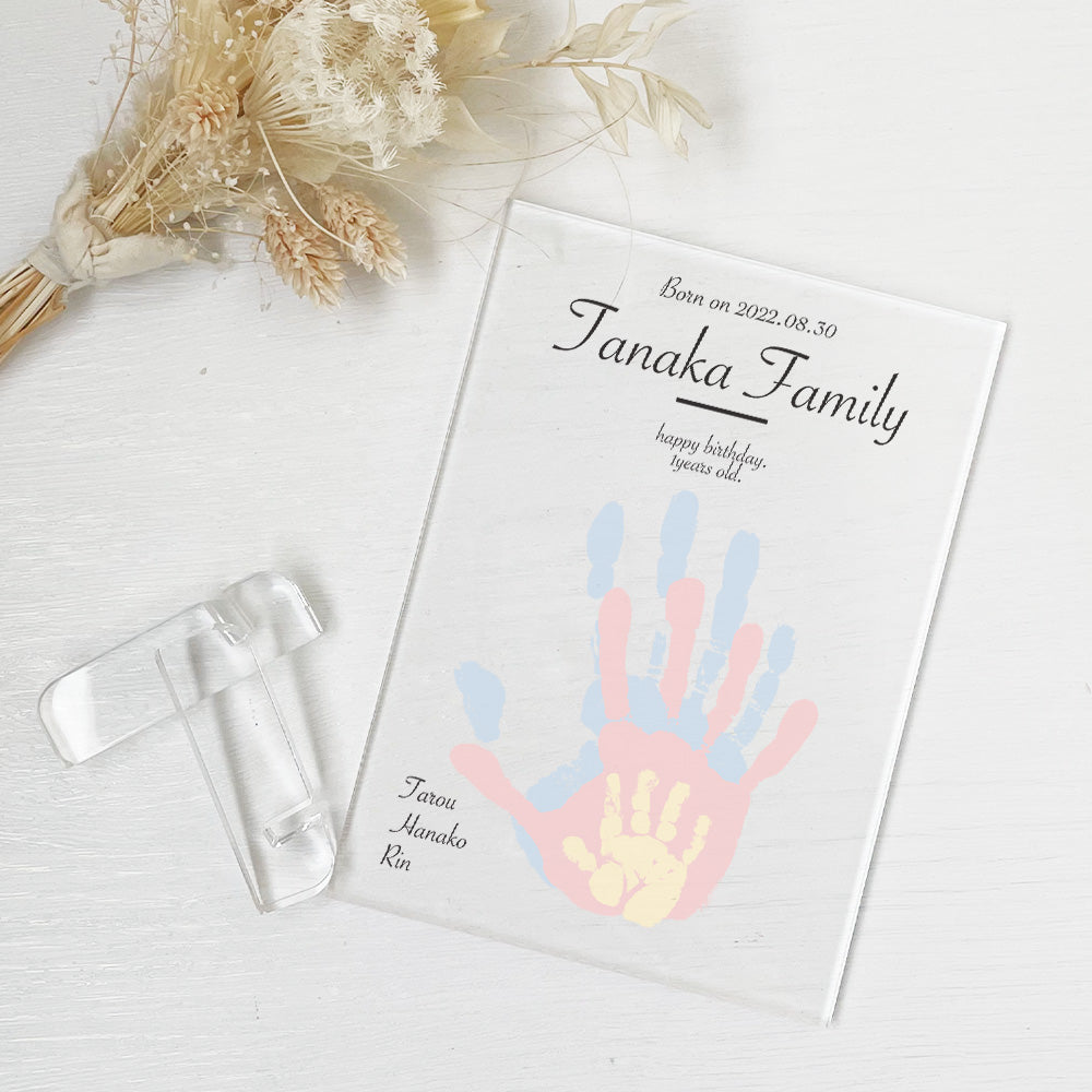 お母さん お父さん お子様 デザインの手形を重ねて作る世界に一つのアート作品。メッセージを組み合わせてプリントできます。アクリルの透明感がスタイリッシュで高級感のある定番人気商品です!