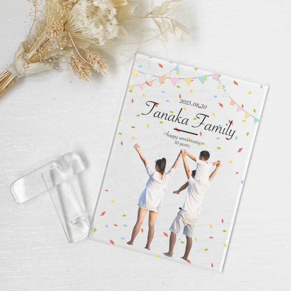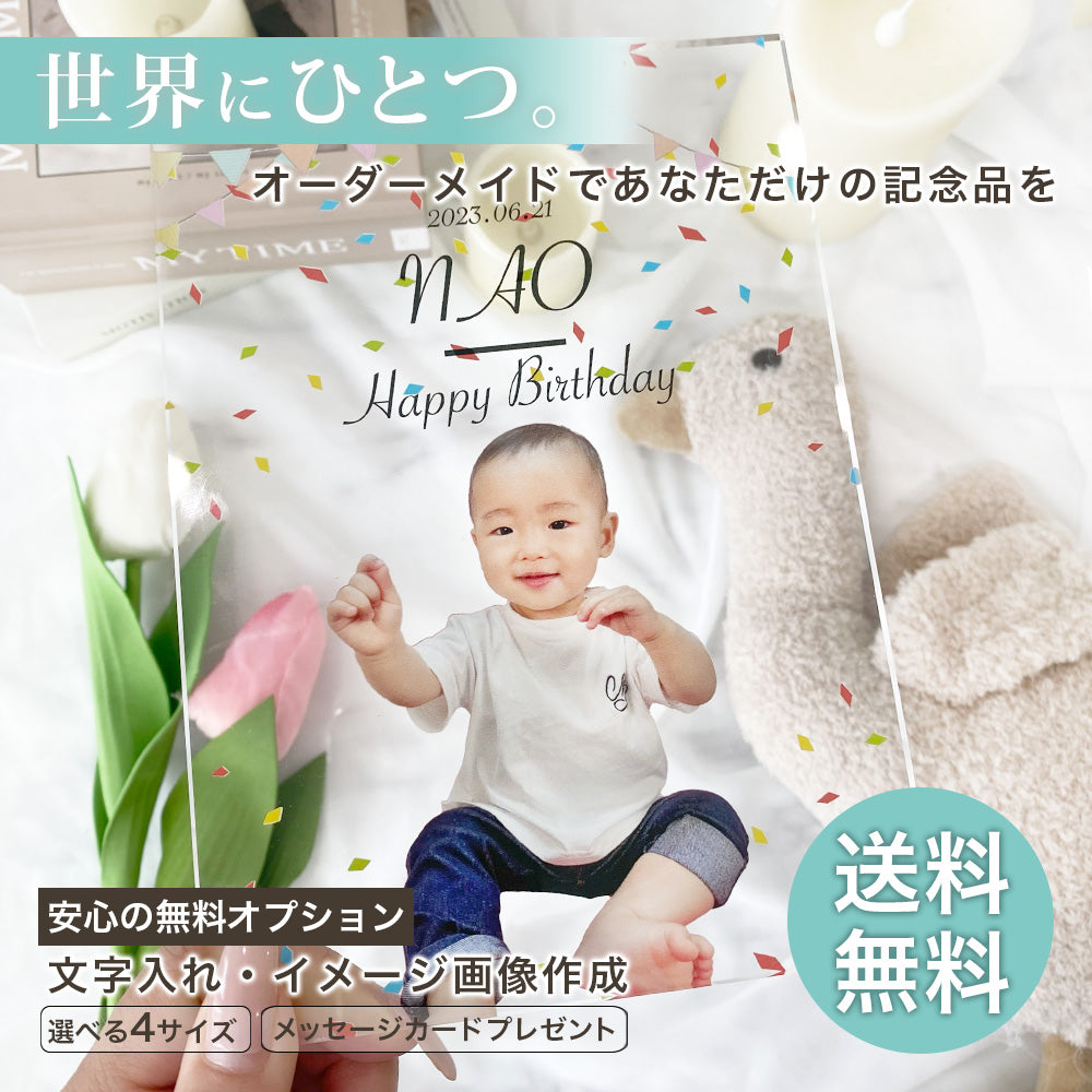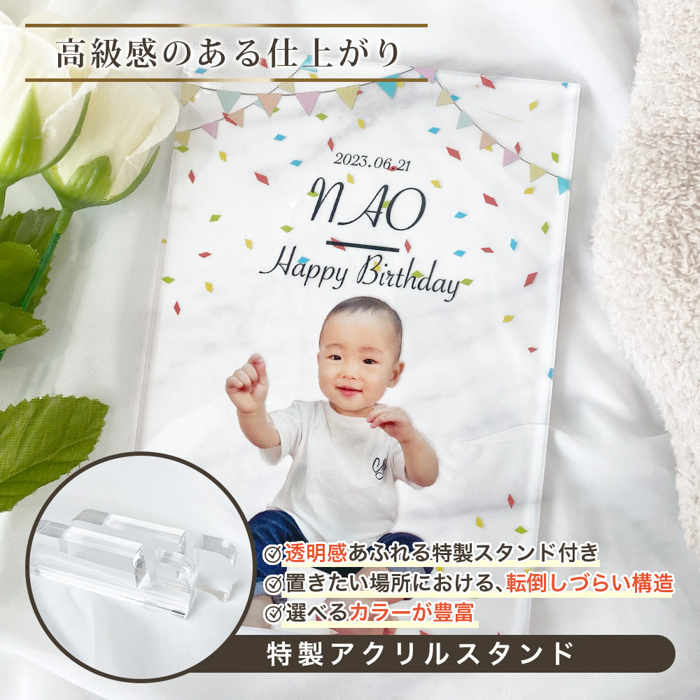 お子様の写真と名前、選択肢を表す使えるアクリルパネル。