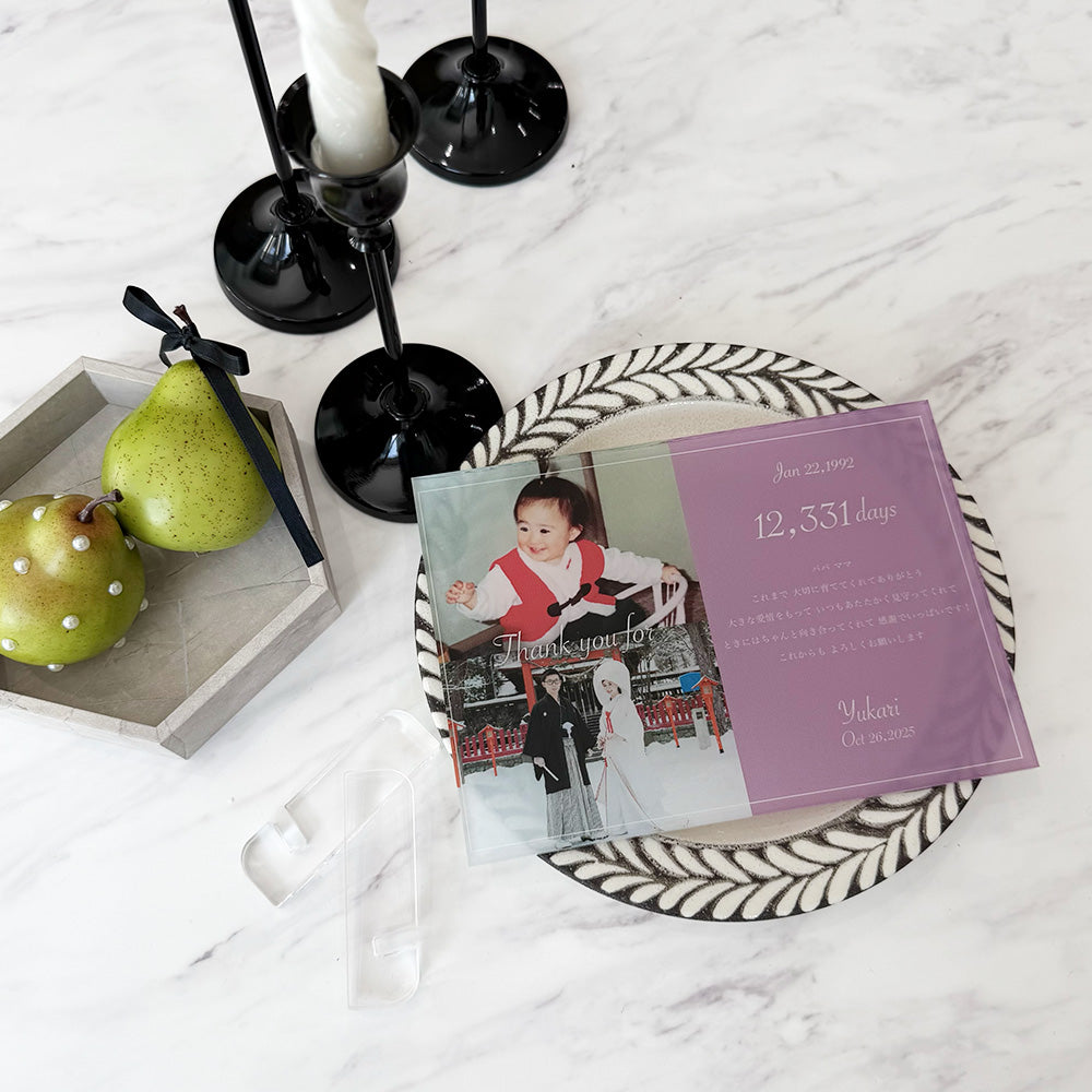 お写真とメッセージを組み合わせて使えるアクリルパネル。 シンプルでありながらどこに飾っても可愛いアクリルパネルは当店の人気商品です。 セットでアクリルのスタンドが付属しております。