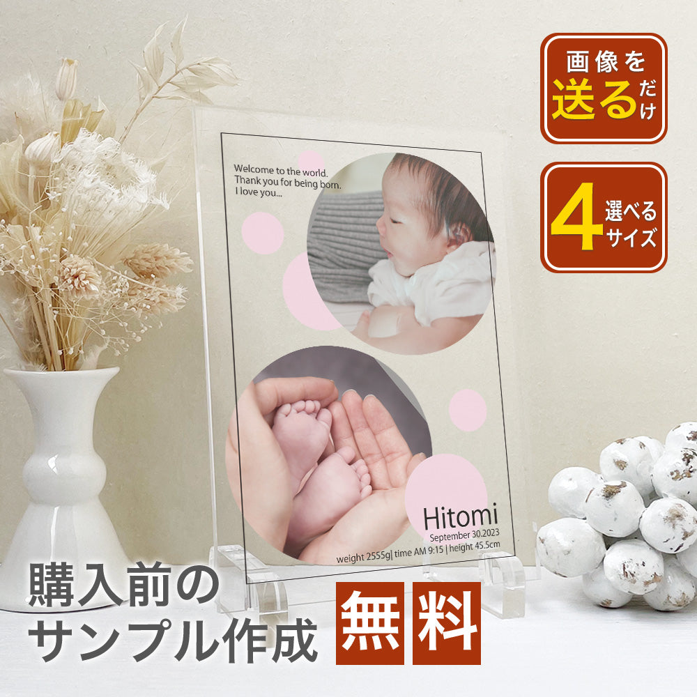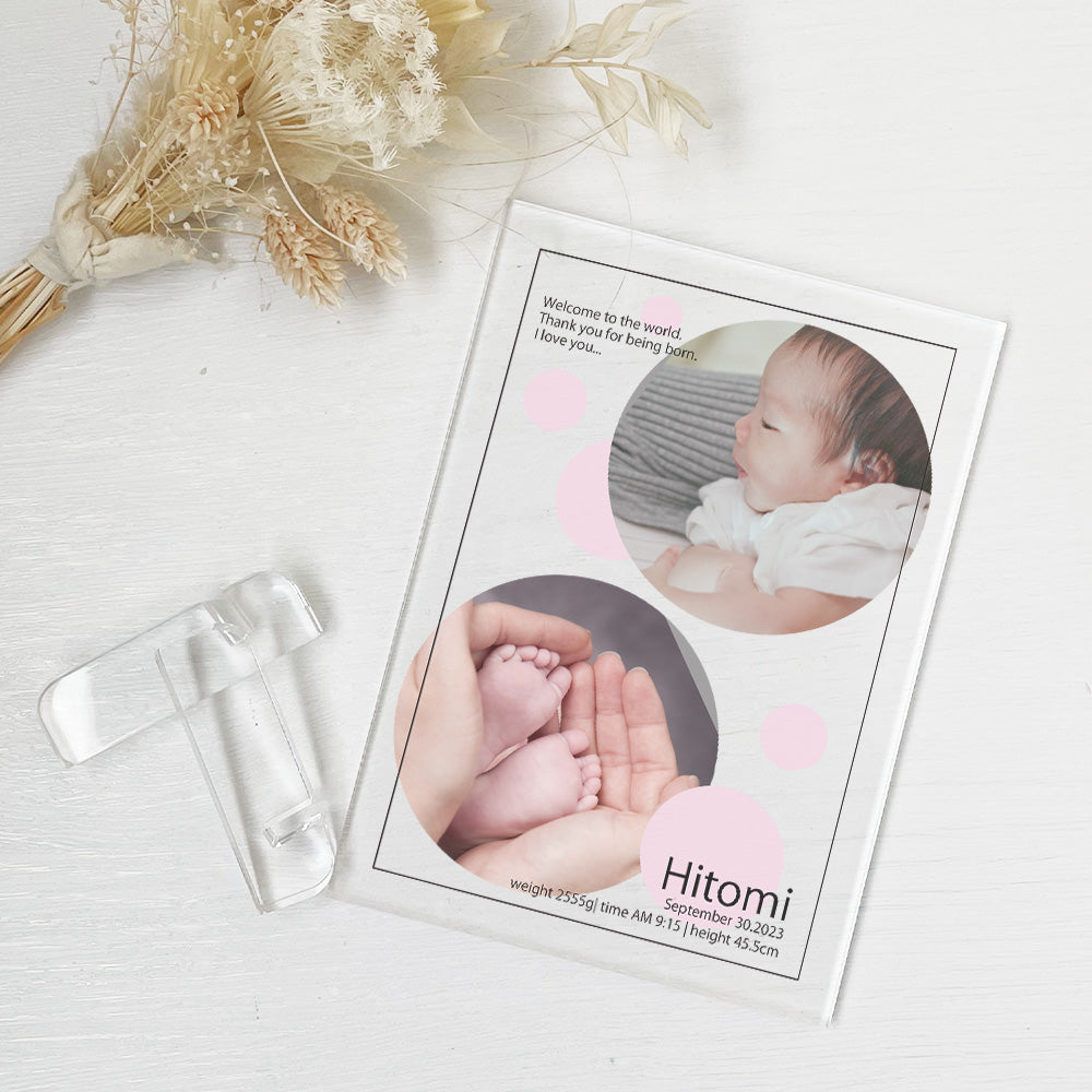 お写真2枚とメッセージを組み合わせて使えるアクリルパネル。 シンプルでありながらどこに飾っても可愛いアクリルパネルは当店の人気商品です。 セットでアクリルのスタンドが付属しております。