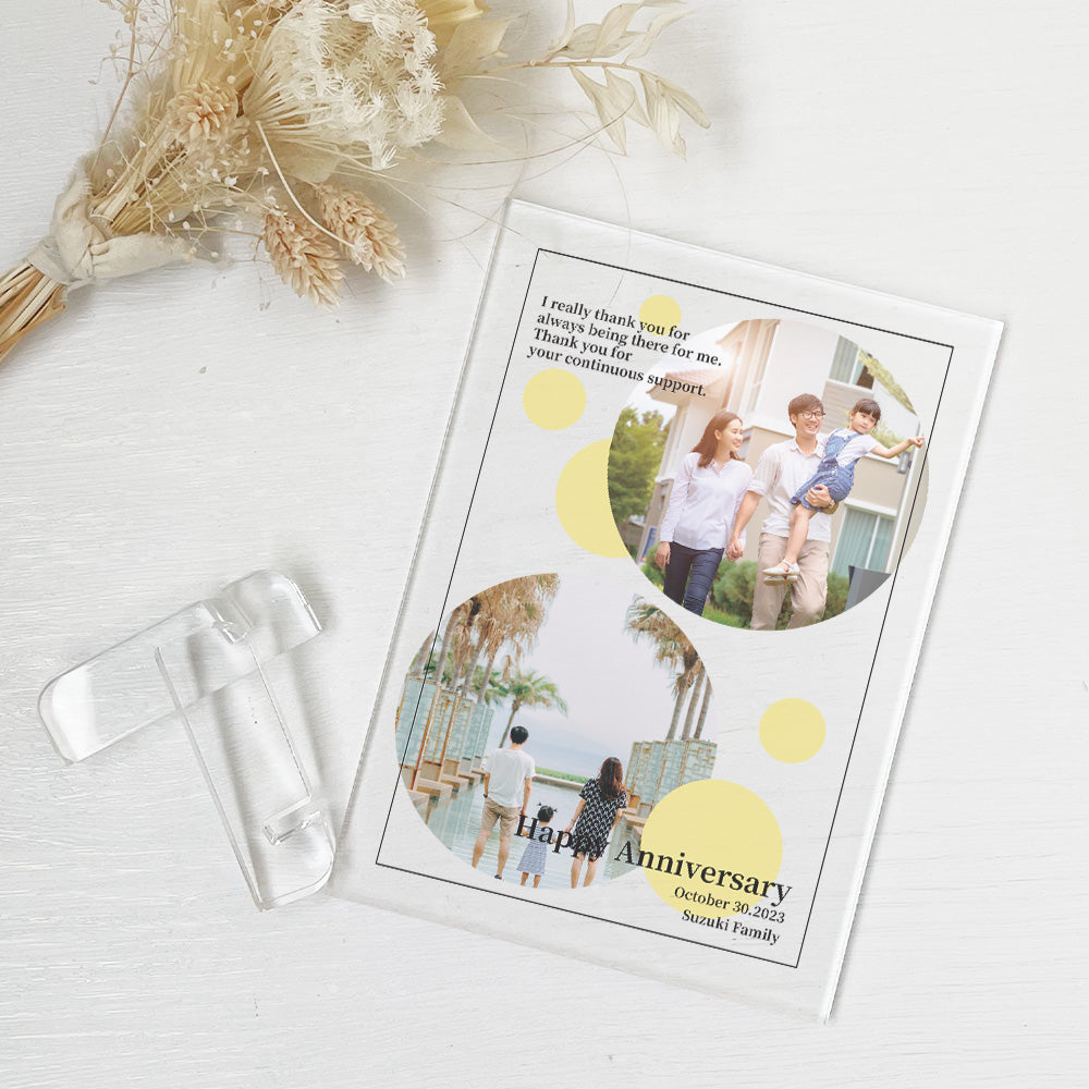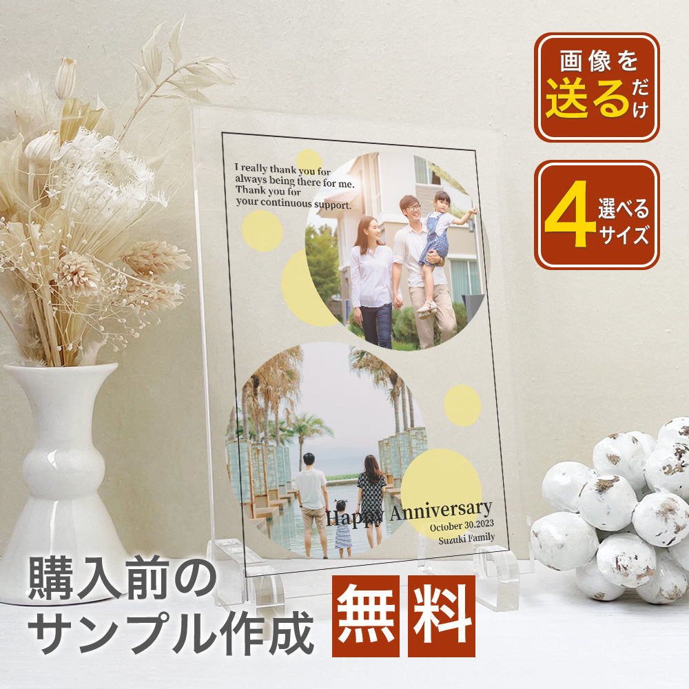 お写真2枚とメッセージを組み合わせて使えるアクリルパネル。 シンプルでありながらどこに飾っても可愛いアクリルパネルは当店の人気商品です。 セットでアクリルのスタンドが付属しております。