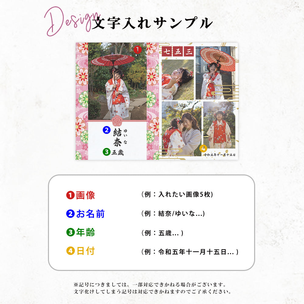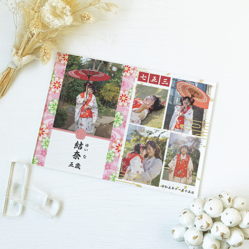 かわいい七五三デザイン!お写真5枚とメッセージを組み合わせて使えるアクリルパネル。 シンプルでありながらどこに飾っても可愛いアクリルパネルは当店の人気商品です。 セットでアクリルのスタンドが付属しております。