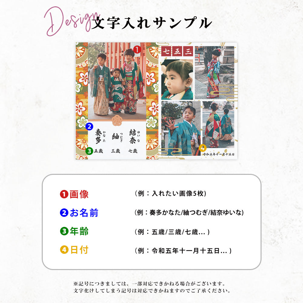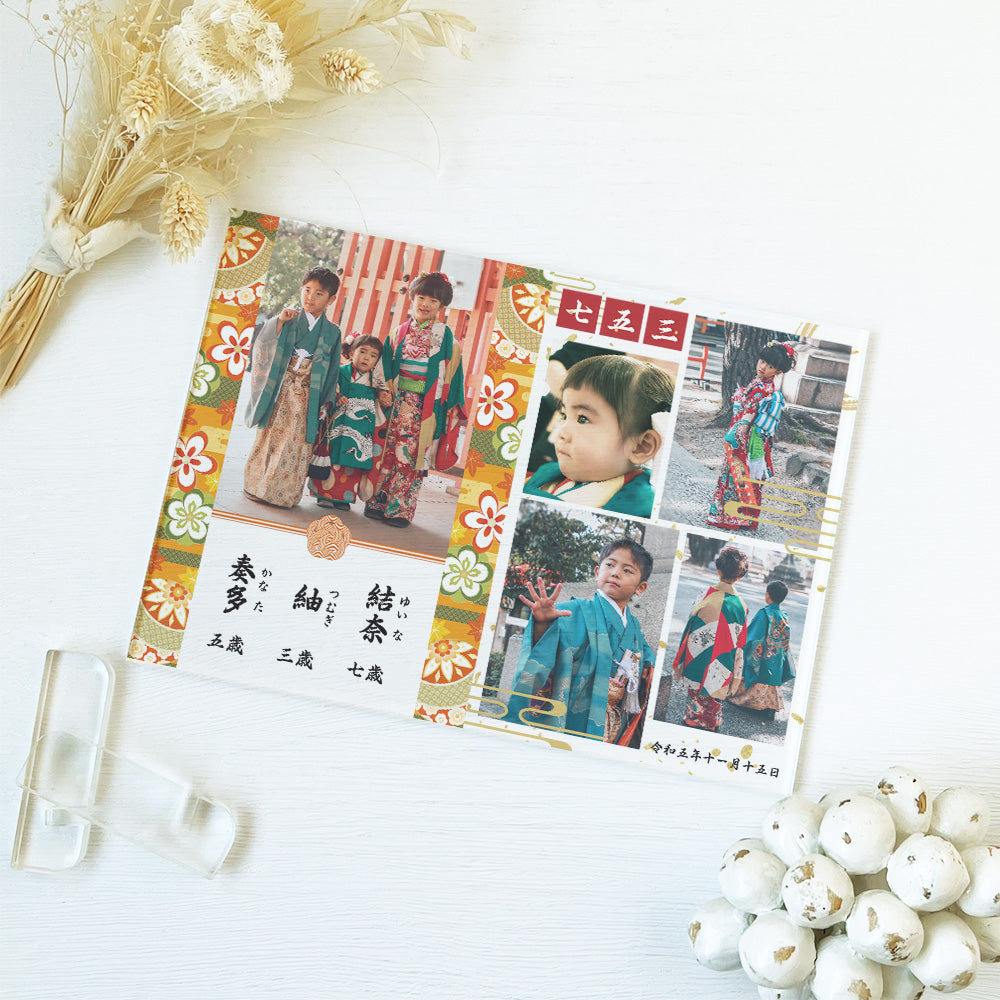 かわいい七五三デザイン!お写真5枚とメッセージを組み合わせて使えるアクリルパネル。 シンプルでありながらどこに飾っても可愛いアクリルパネルは当店の人気商品です。 セットでアクリルのスタンドが付属しております。