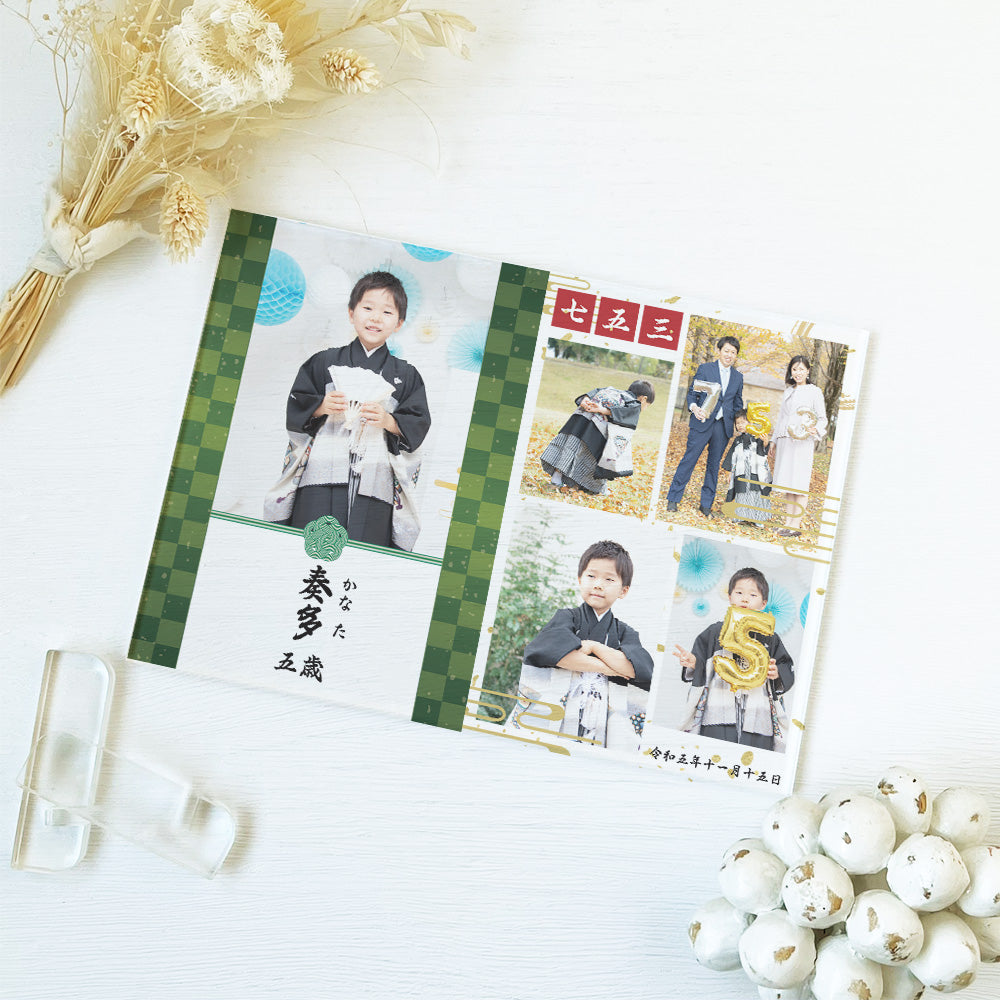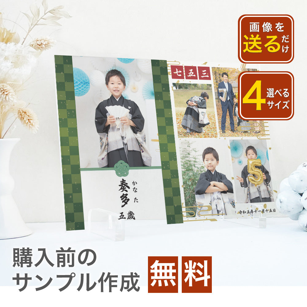 かわいい七五三デザイン!お写真5枚とメッセージを組み合わせて使えるアクリルパネル。 シンプルでありながらどこに飾っても可愛いアクリルパネルは当店の人気商品です。 セットでアクリルのスタンドが付属しております。