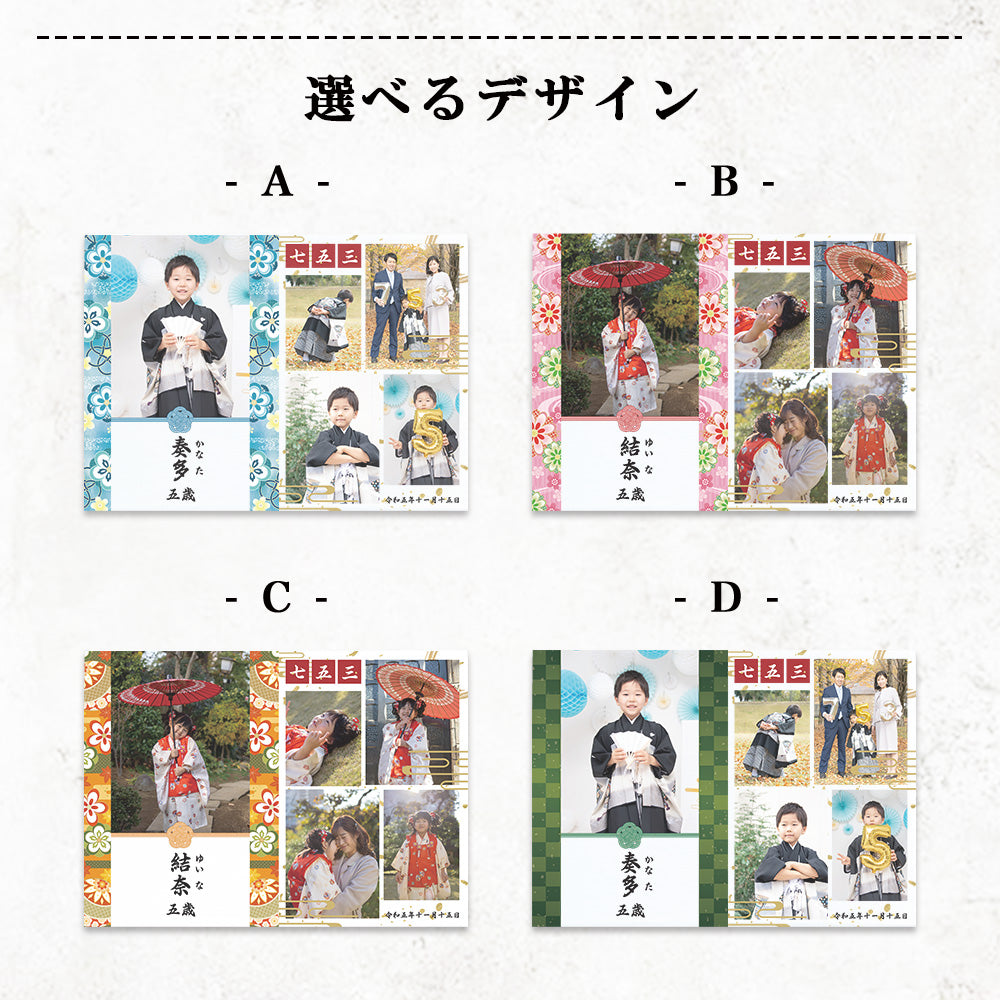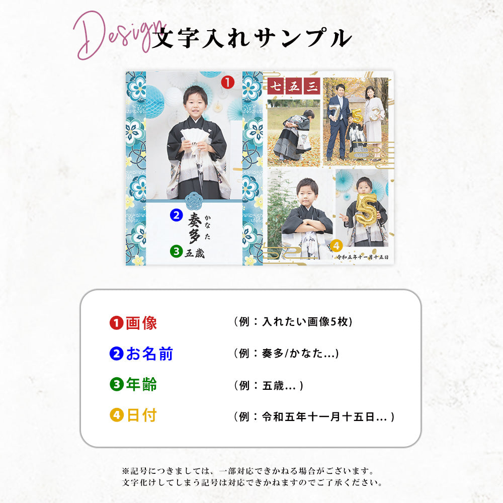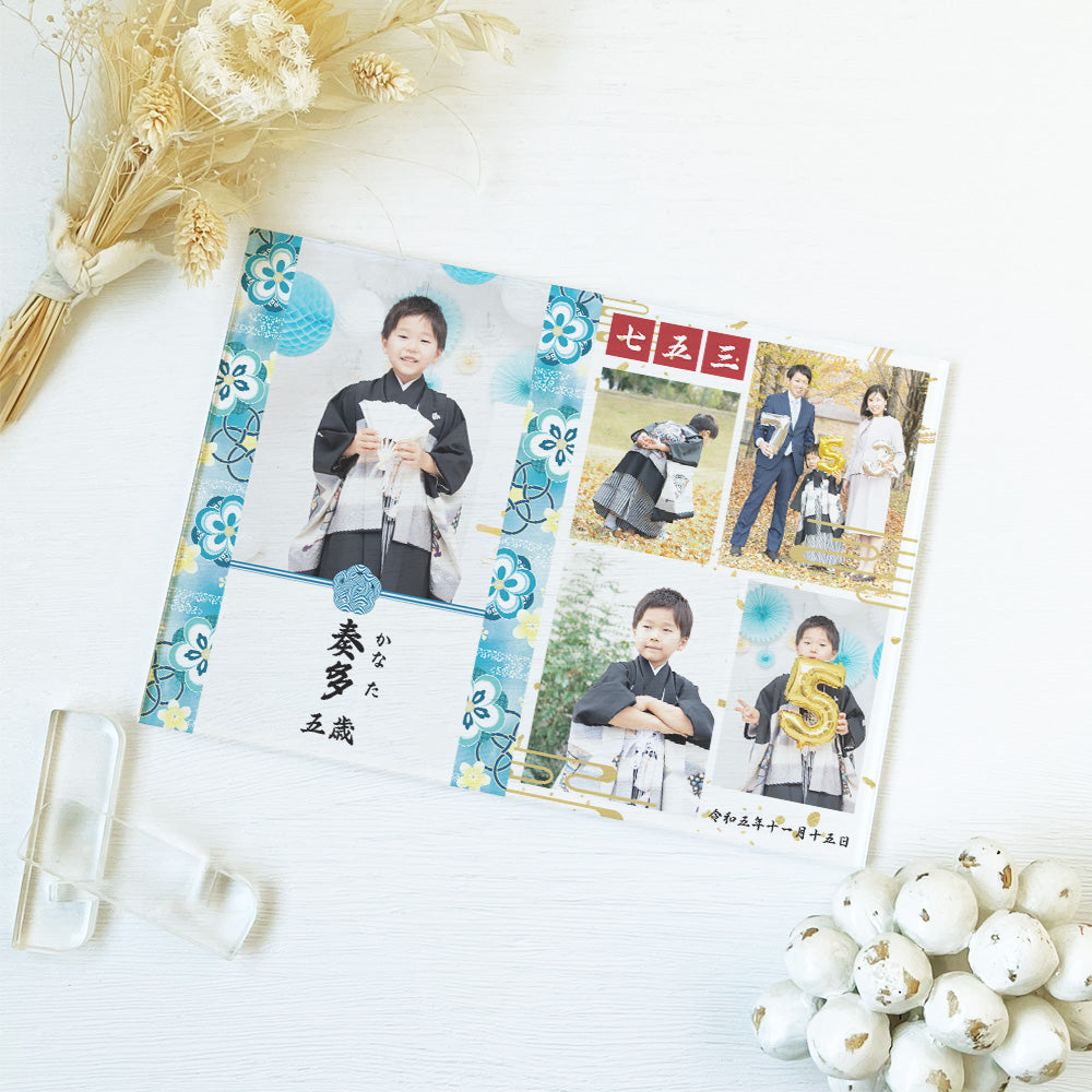 かわいい七五三デザイン!お写真5枚とメッセージを組み合わせて使えるアクリルパネル。 シンプルでありながらどこに飾っても可愛いアクリルパネルは当店の人気商品です。 セットでアクリルのスタンドが付属しております。