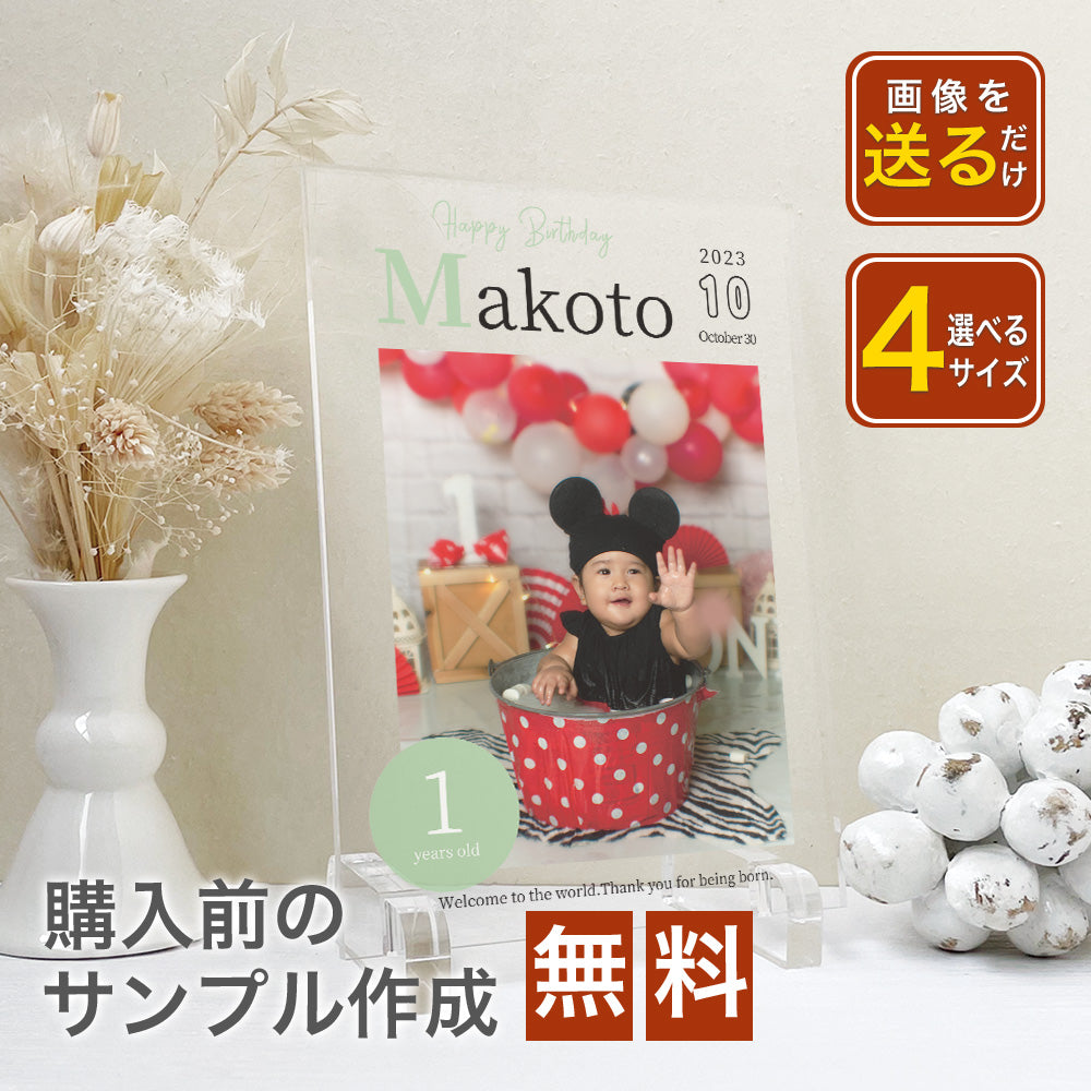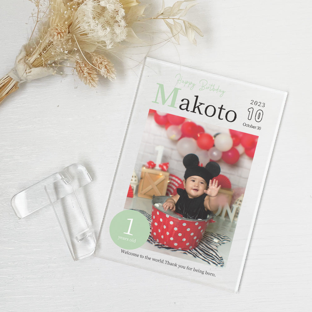 お写真1枚とメッセージを組み合わせて使えるアクリルパネル。 シンプルでありながらどこに飾っても可愛いアクリルパネルは当店の人気商品です。 セットでアクリルのスタンドが付属しており