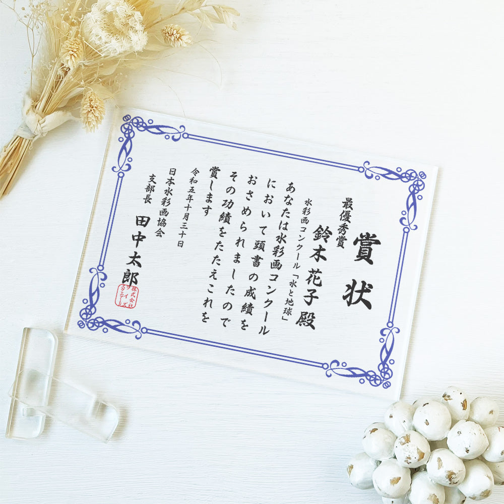 賞状をアクリル全面にプリントした高級感のあるアクリル賞状です。