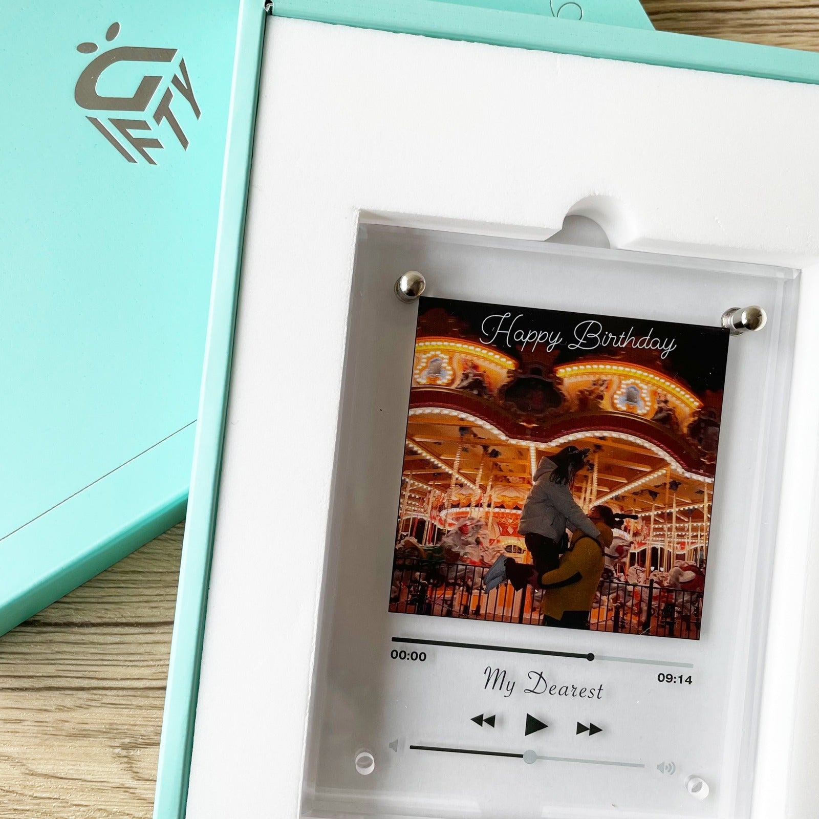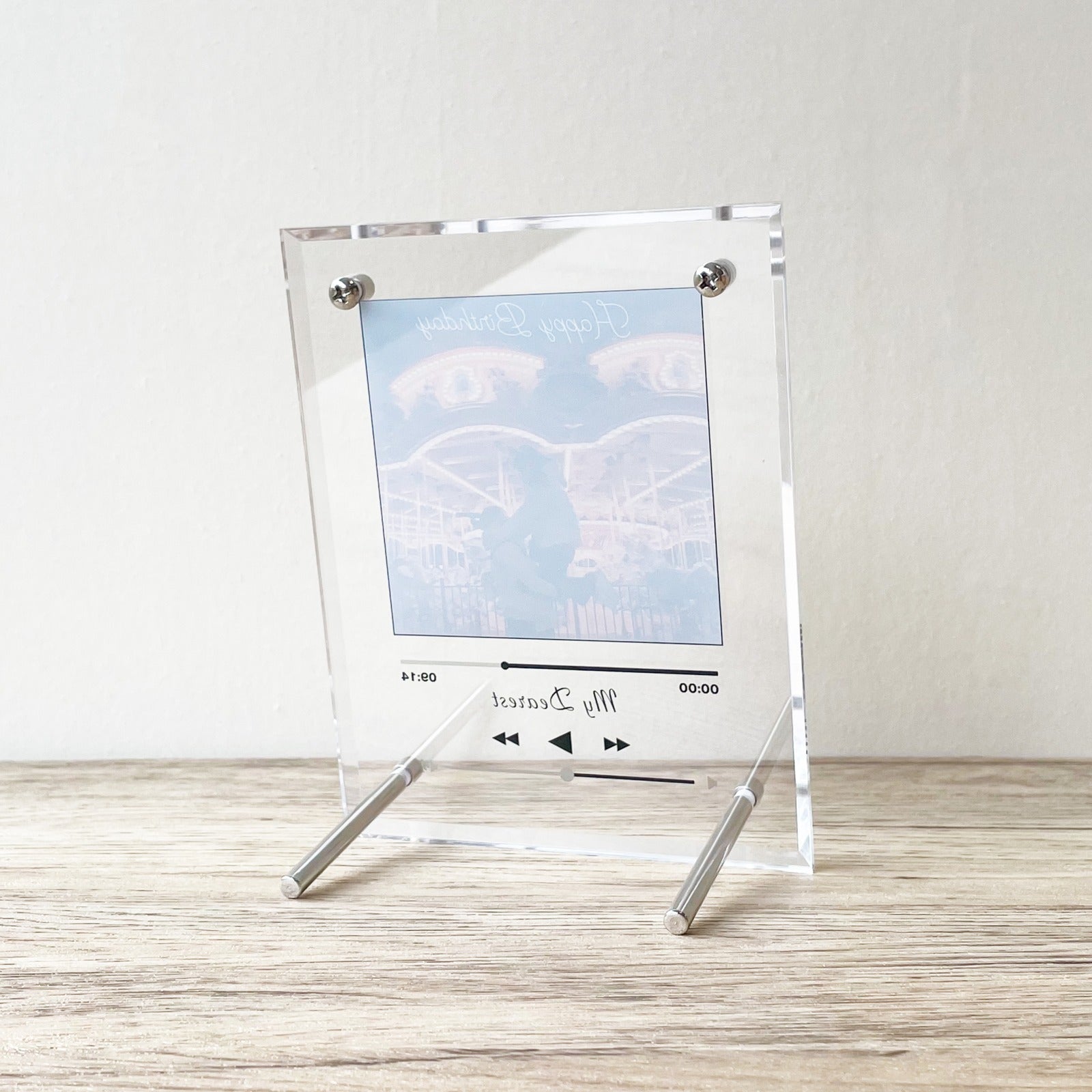 2層アクリルで後面にプリントされたデザインを前面アクリルでカバーすることで剥がれ防止と高級感を演出。セットでシルバースタンドが付属しております。