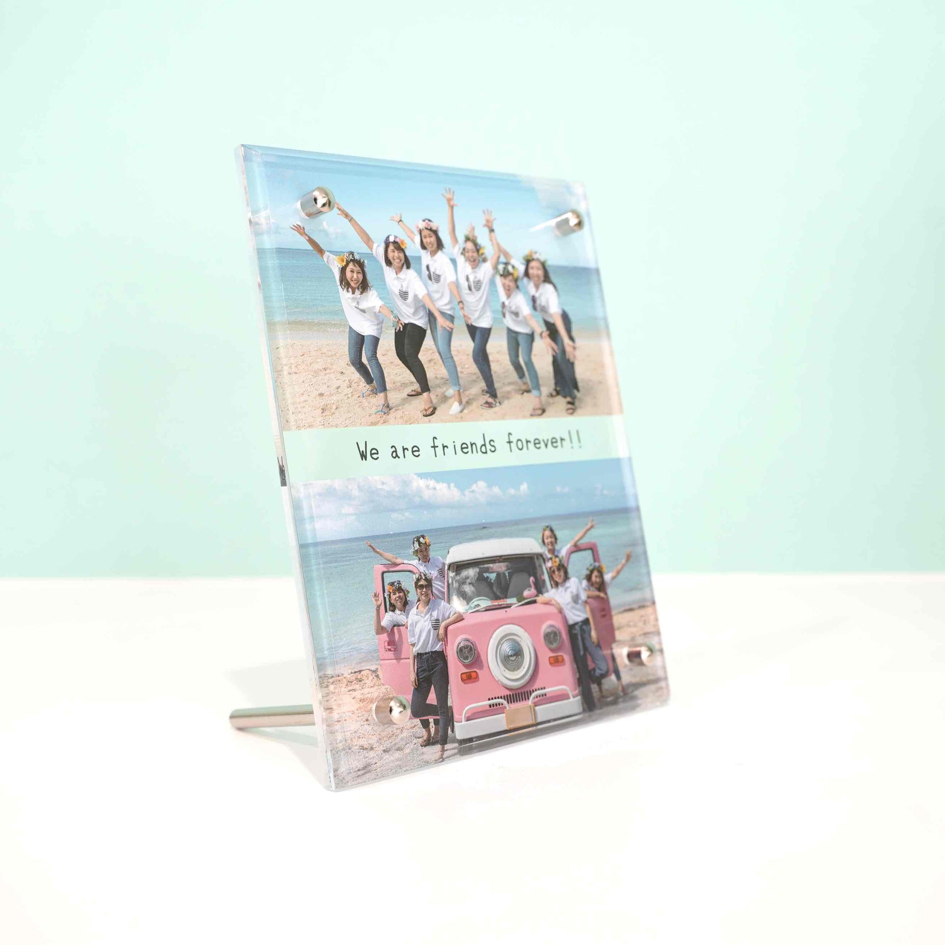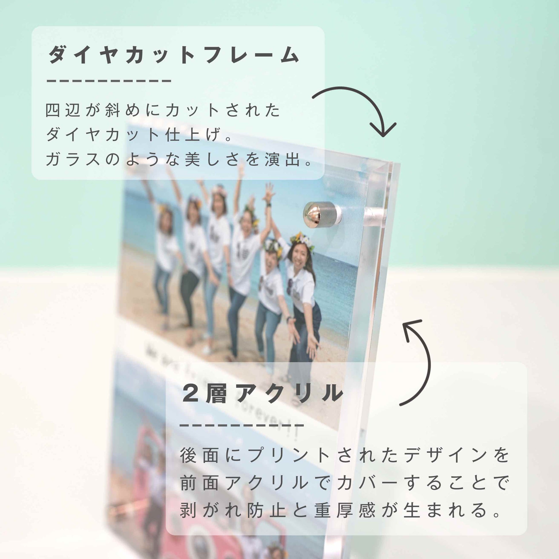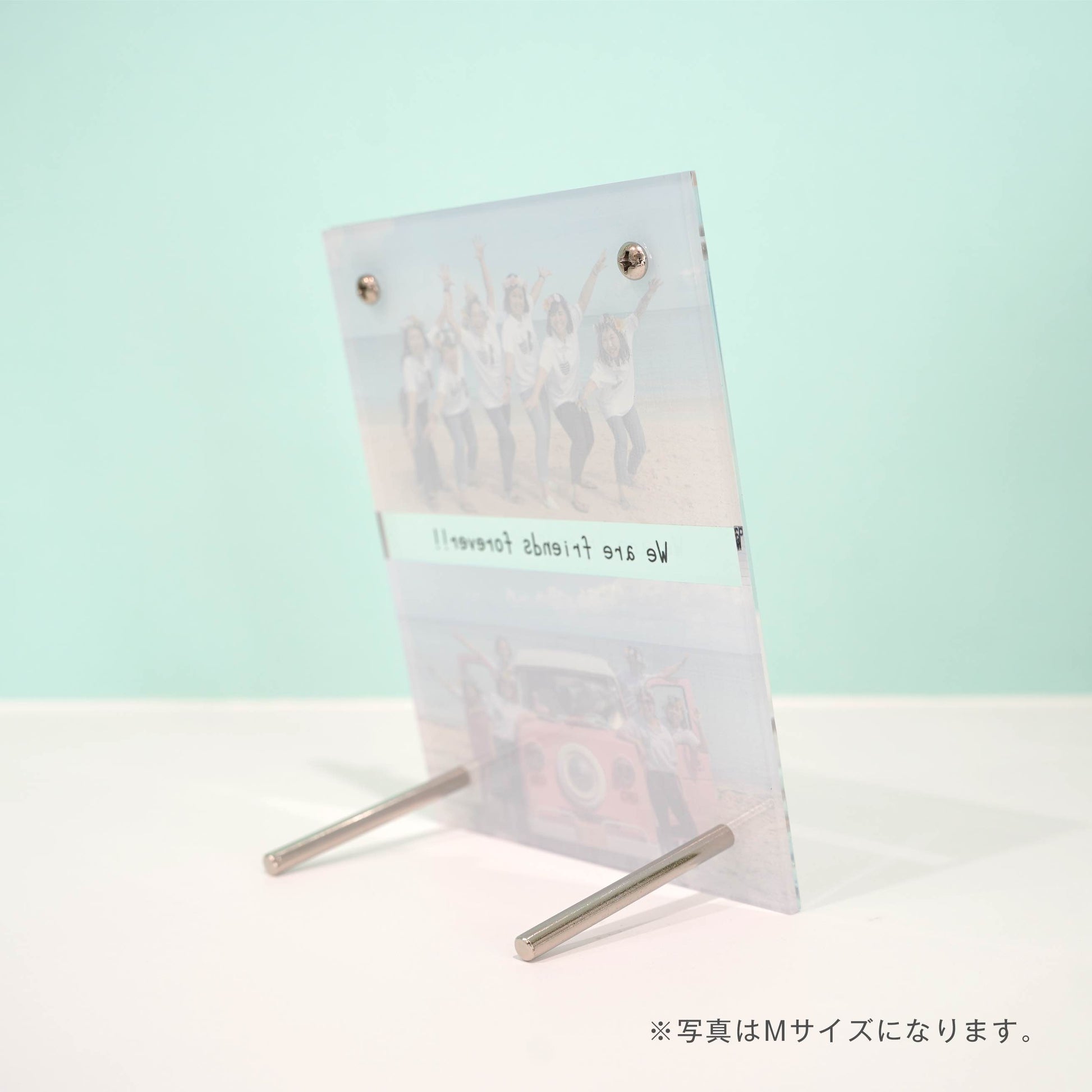 2層アクリルで後面にプリントされたデザインを前面アクリルでカバーすることで剥がれ防止と高級感を演出。セットでシルバースタンドが付属しております。