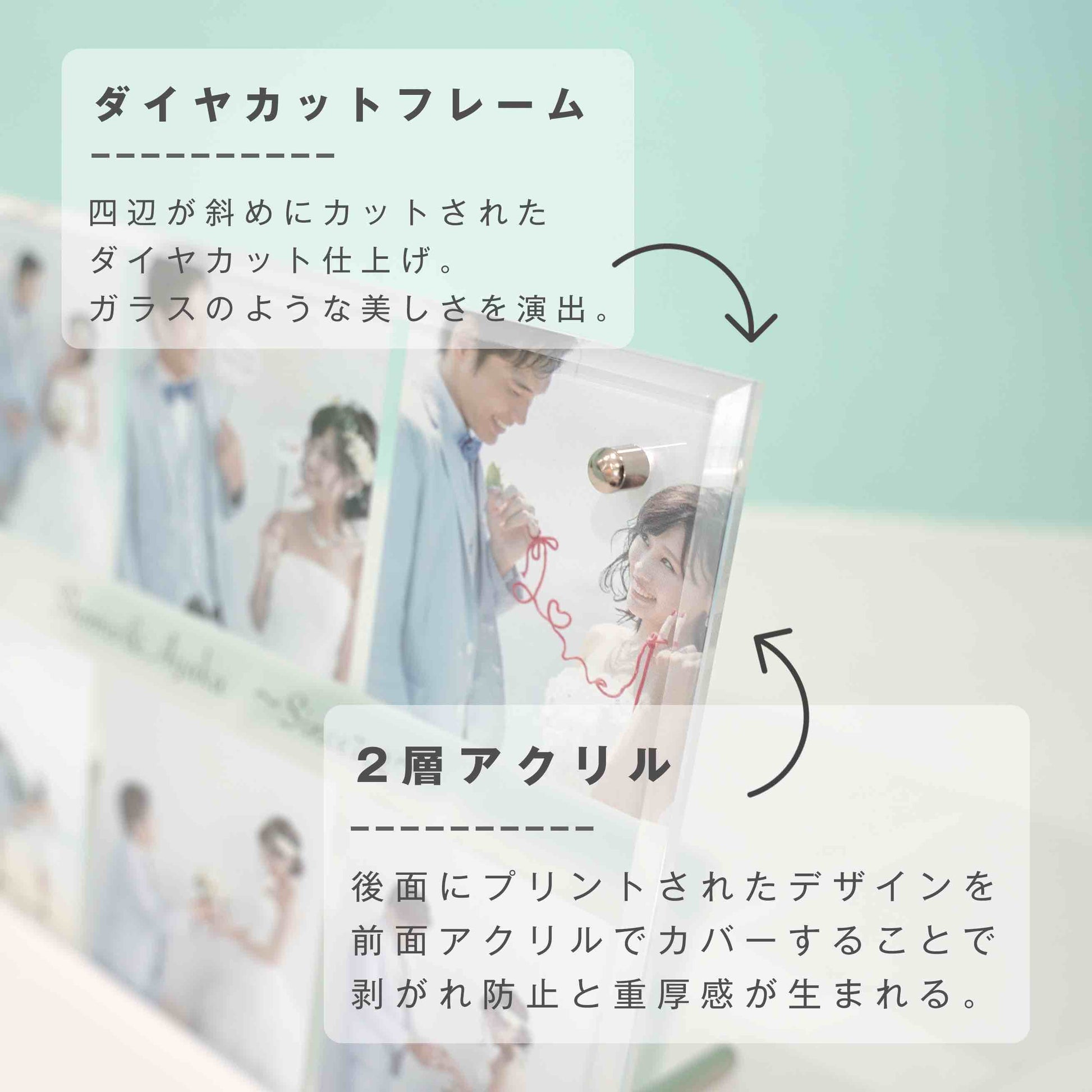 2層アクリルで後面にプリントされたデザインを前面アクリルでカバーすることで剥がれ防止と高級感を演出。セットでシルバースタンドが付属しております。