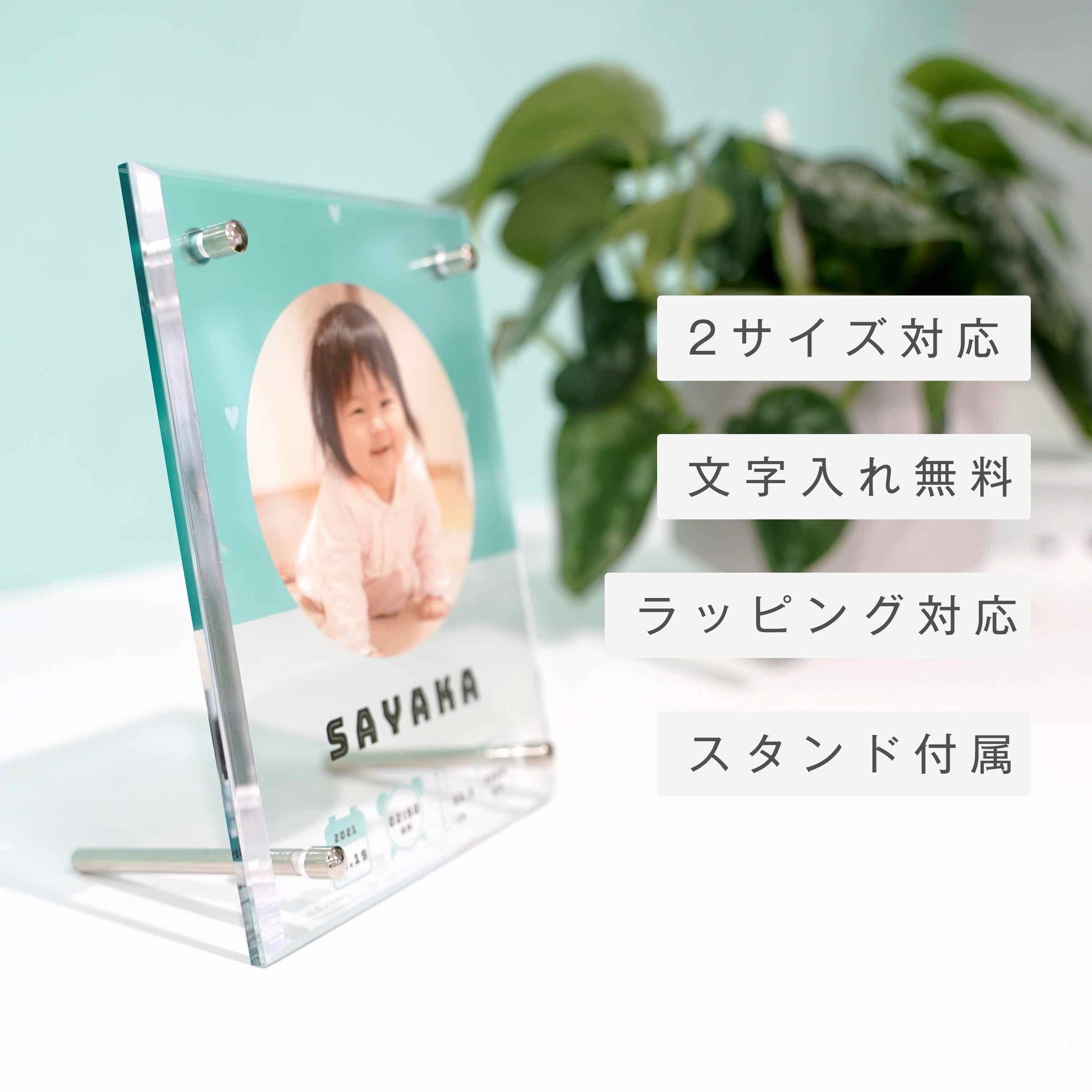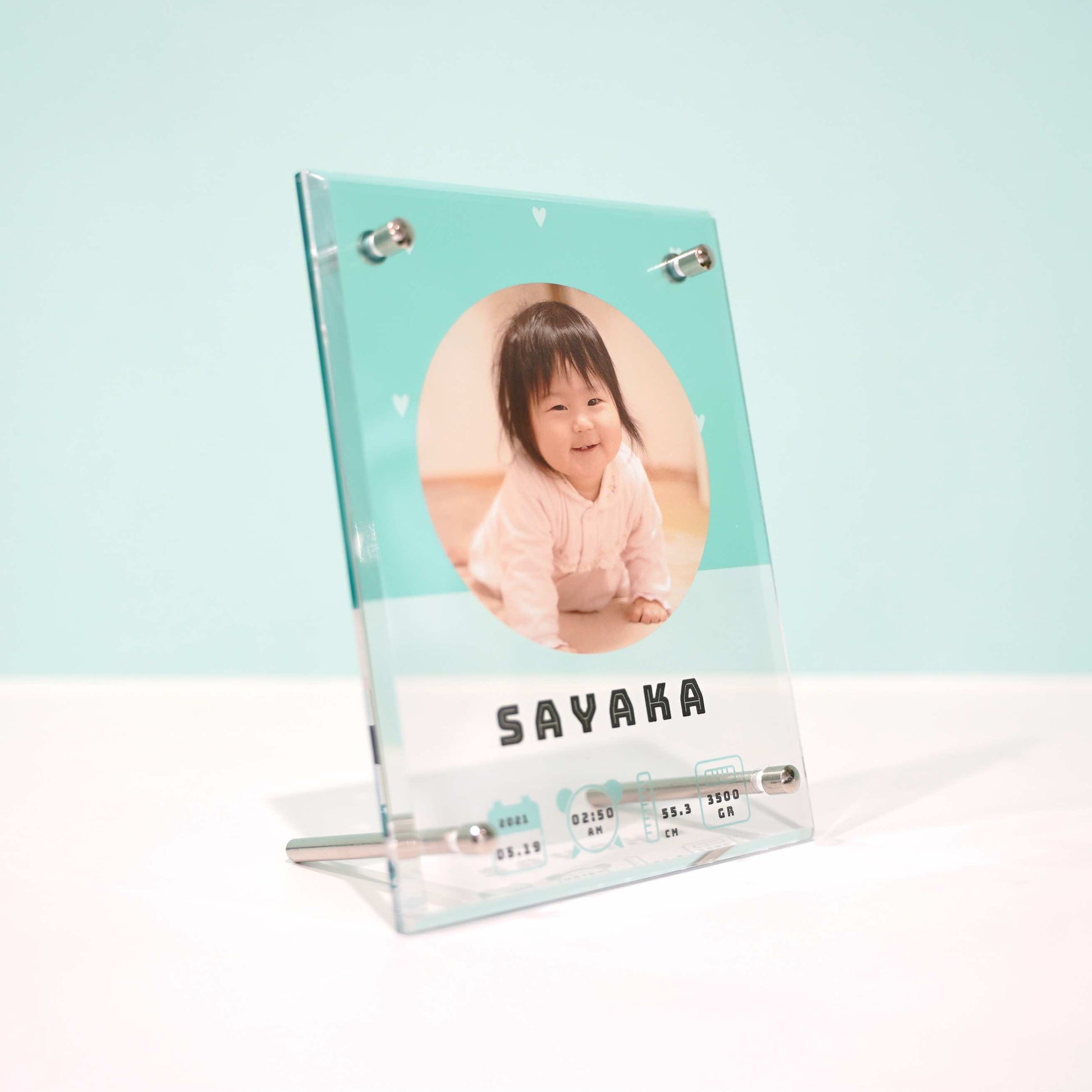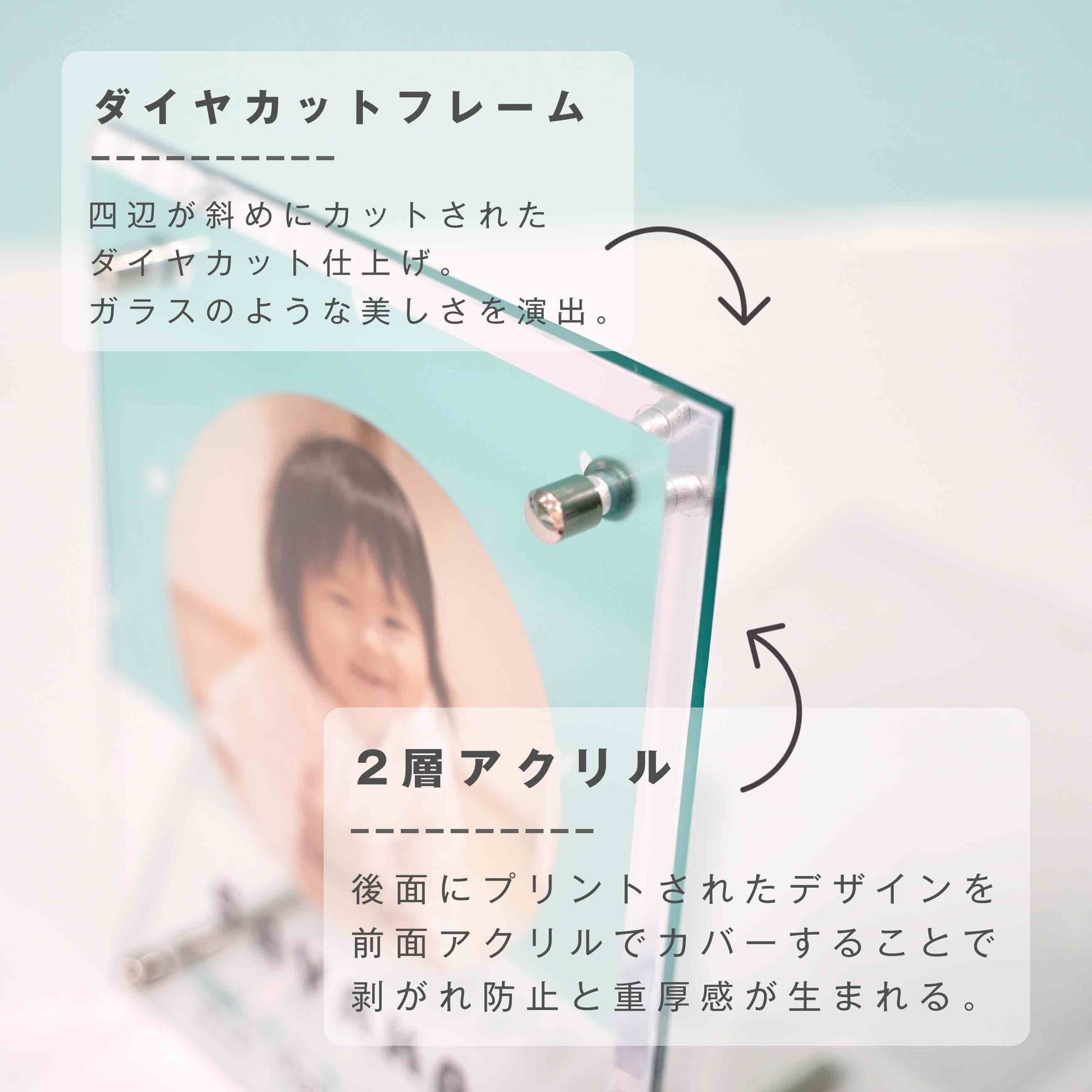 2層アクリルで後面にプリントされたデザインを前面アクリルでカバーすることで剥がれ防止と高級感を演出。セットでシルバースタンドが付属しております。