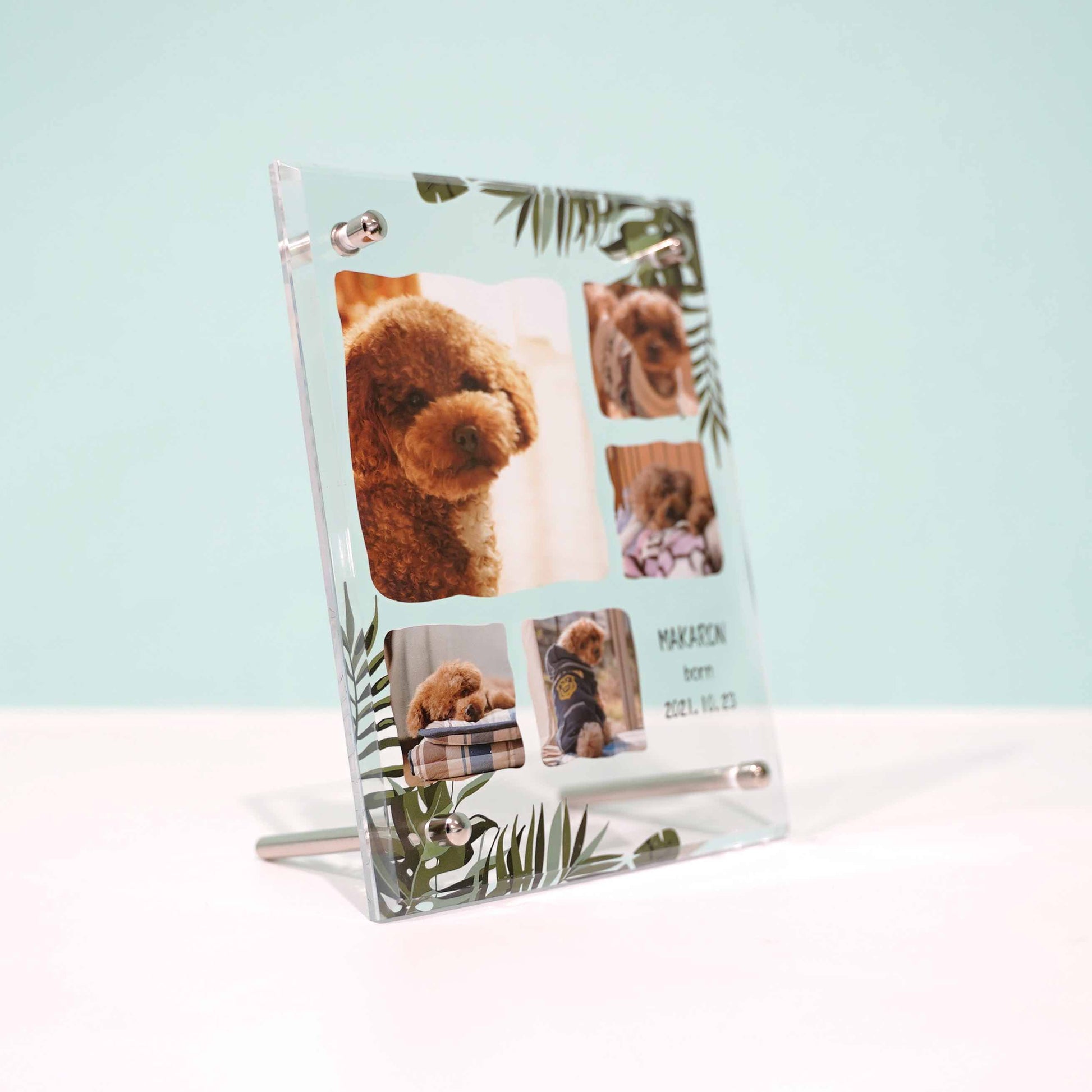 2層アクリルで後面にプリントされたデザインを前面アクリルでカバーすることで剥がれ防止と高級感を演出。セットでシルバースタンドが付属しております。