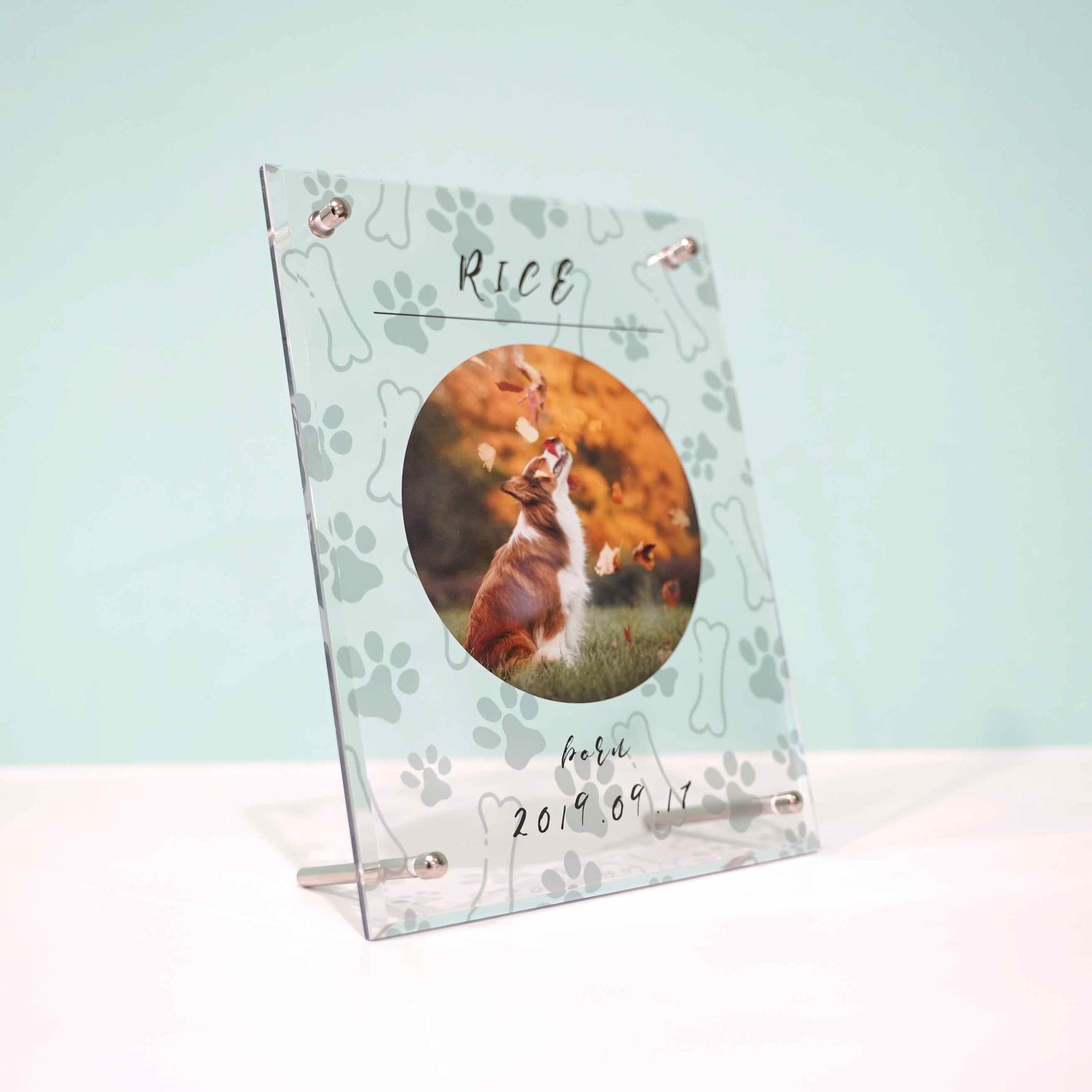 2層アクリルで後面にプリントされたデザインを前面アクリルでカバーすることで剥がれ防止と高級感を演出。セットでシルバースタンドが付属しております。