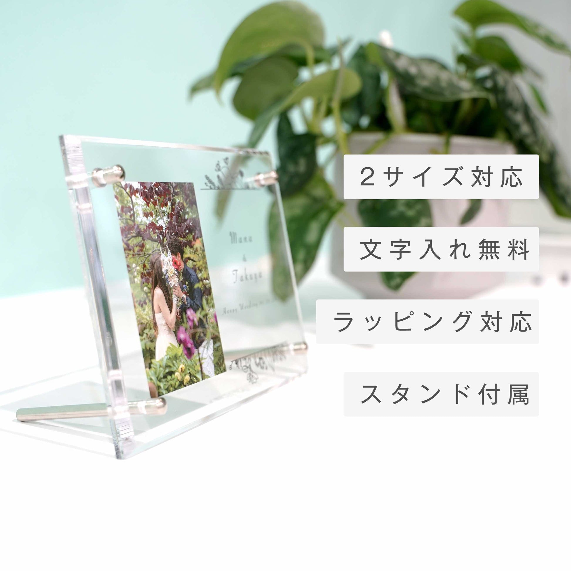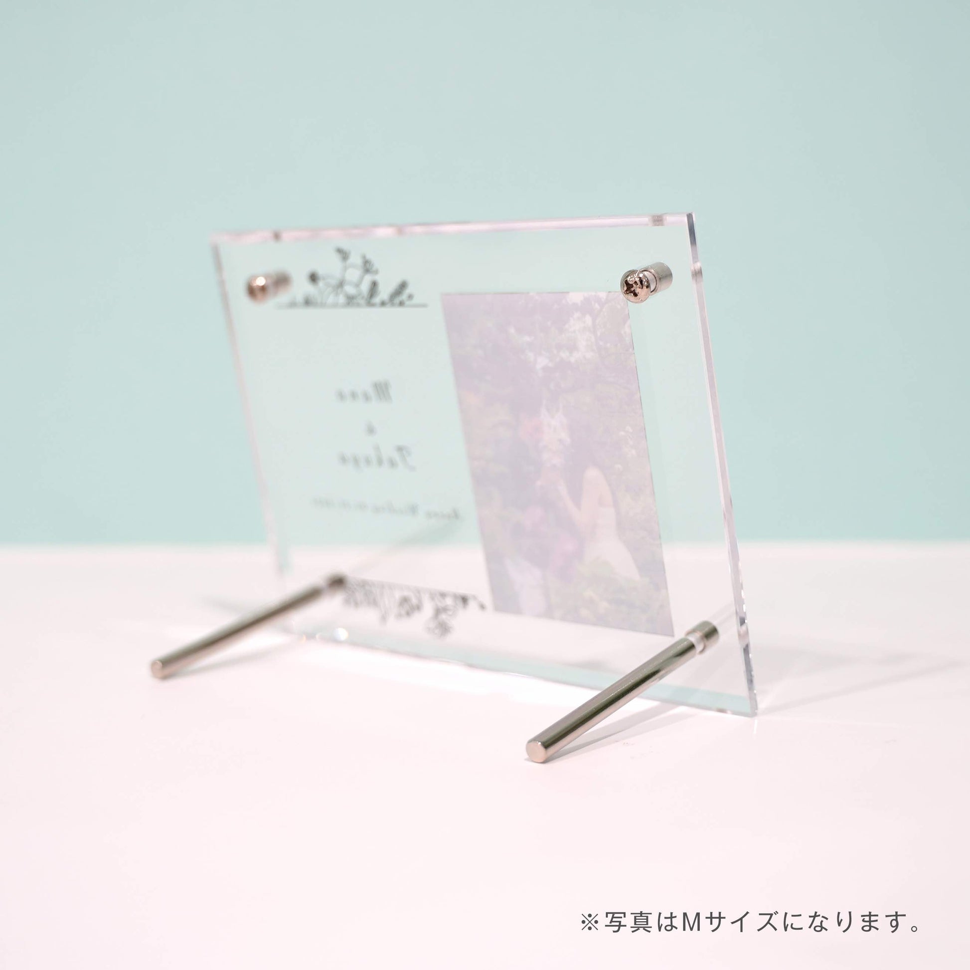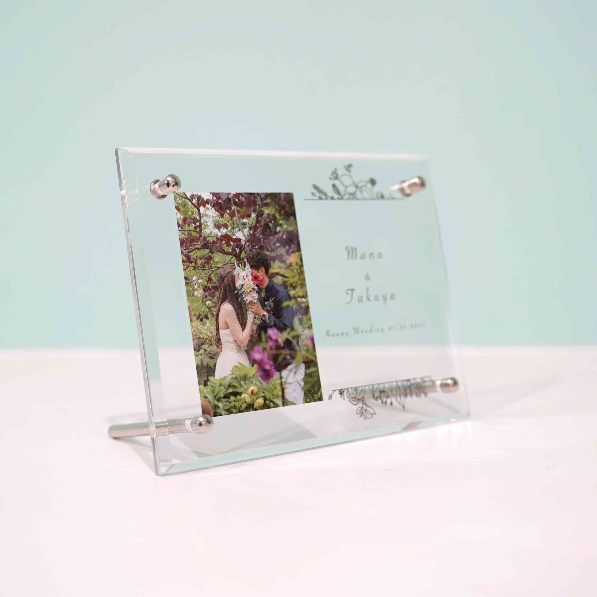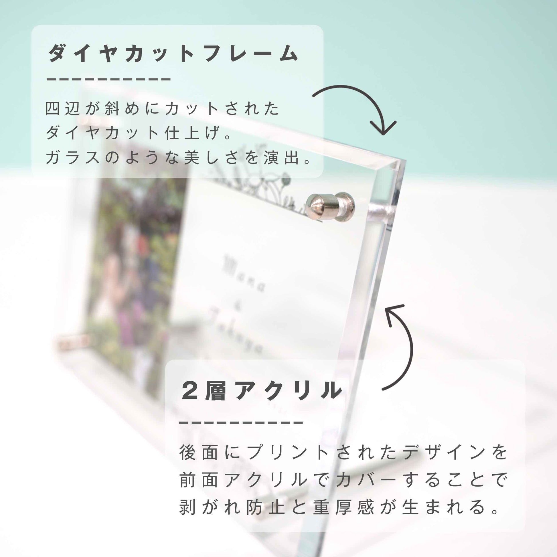 2層アクリルで後面にプリントされたデザインを前面アクリルでカバーすることで剥がれ防止と高級感を演出。セットでシルバースタンドが付属しております。