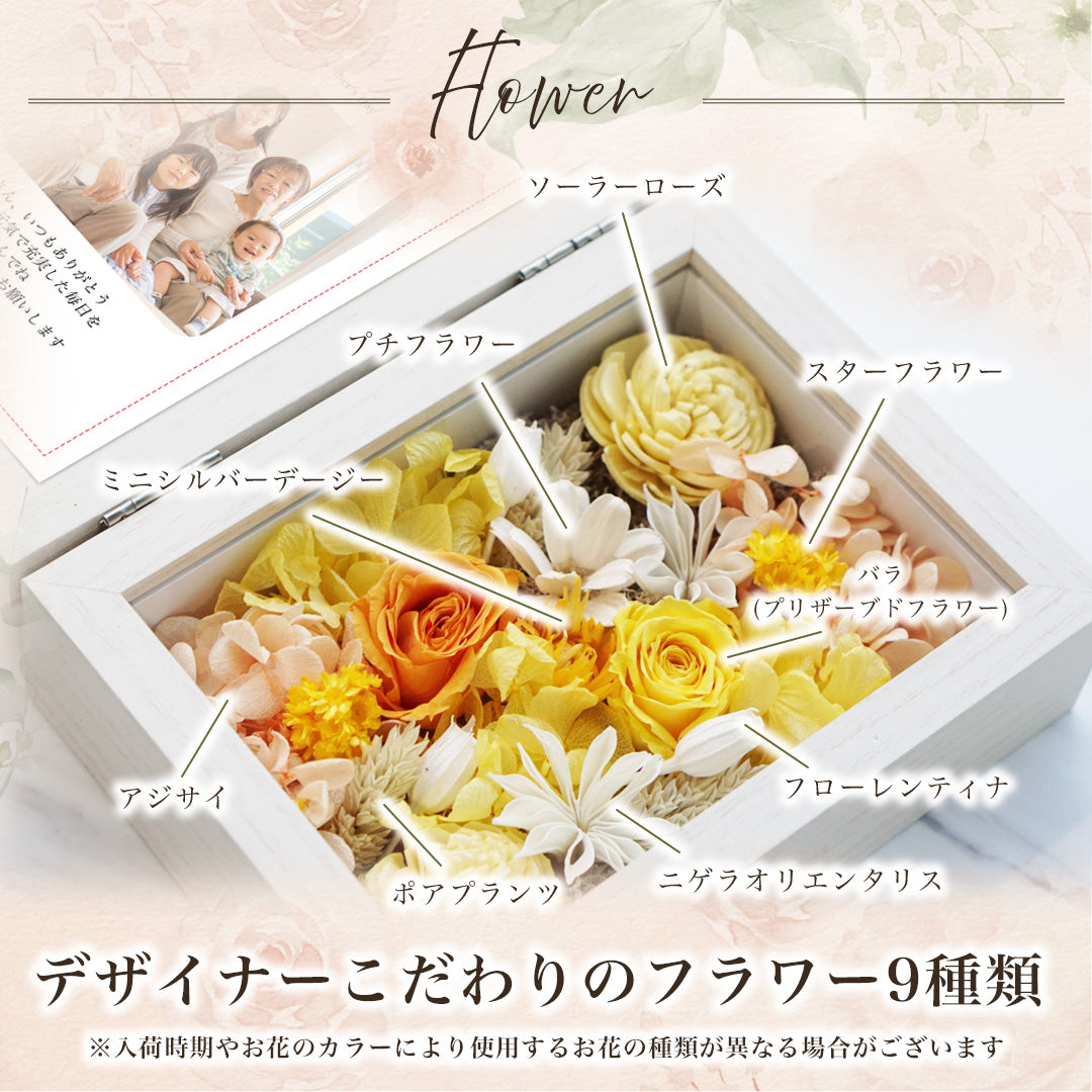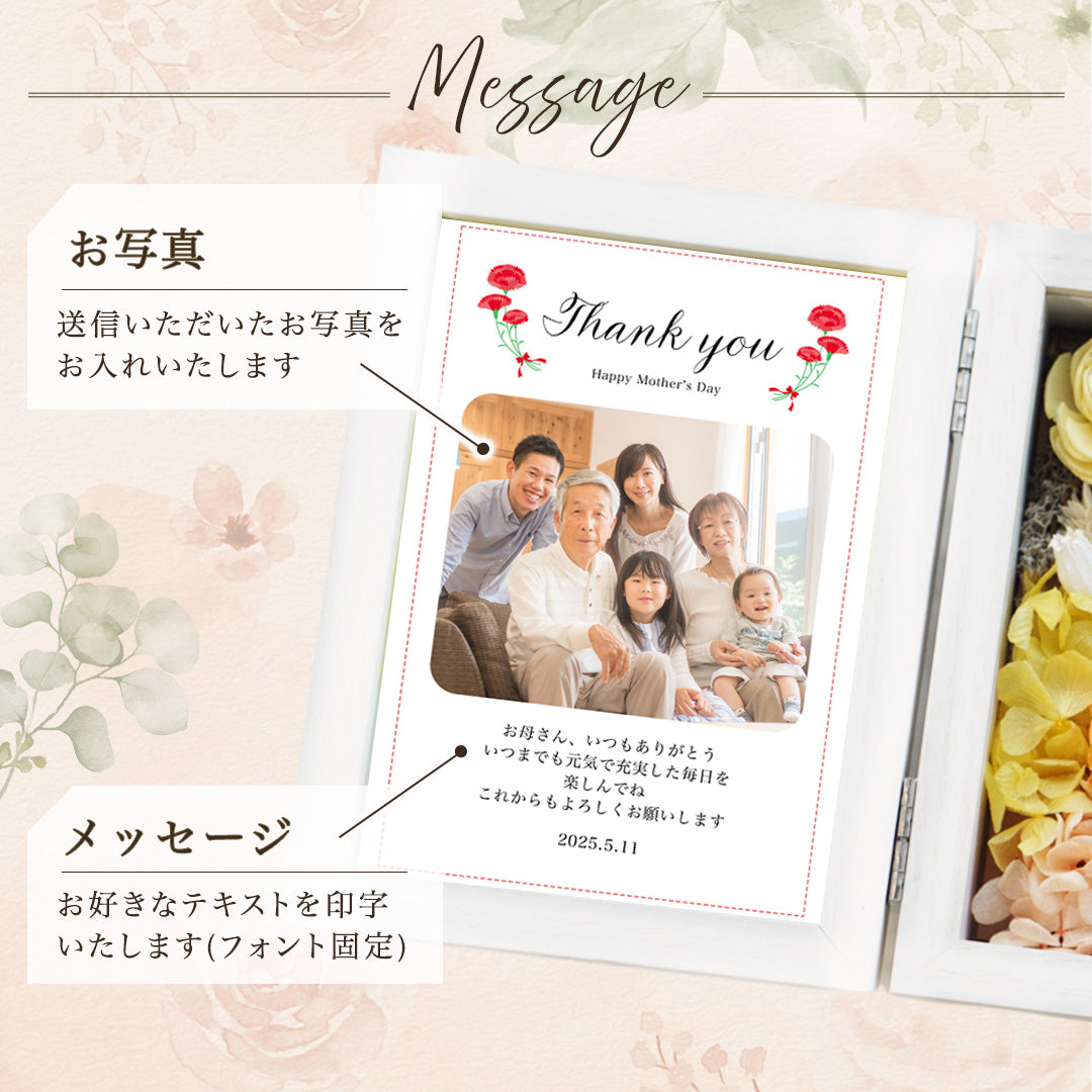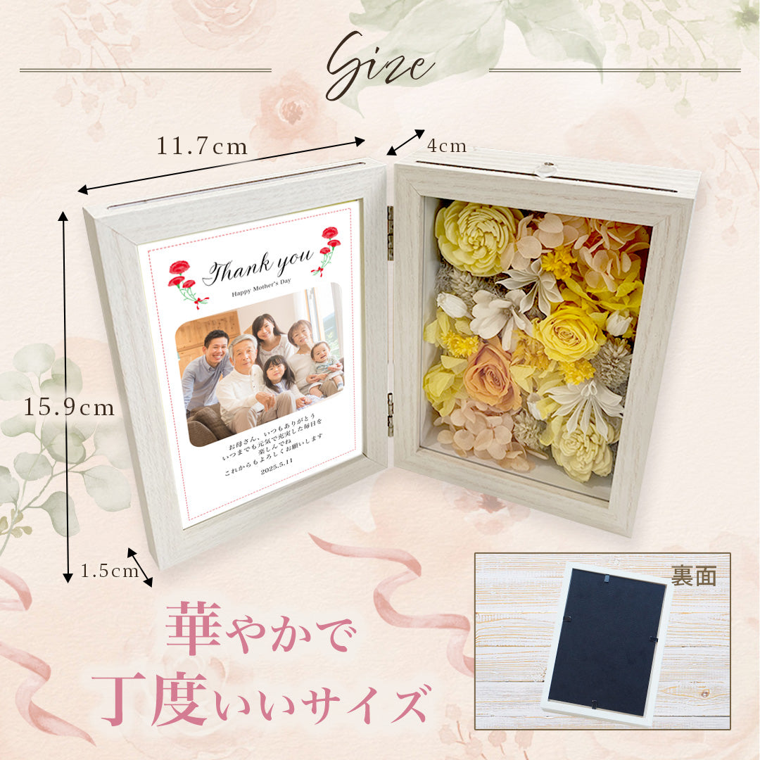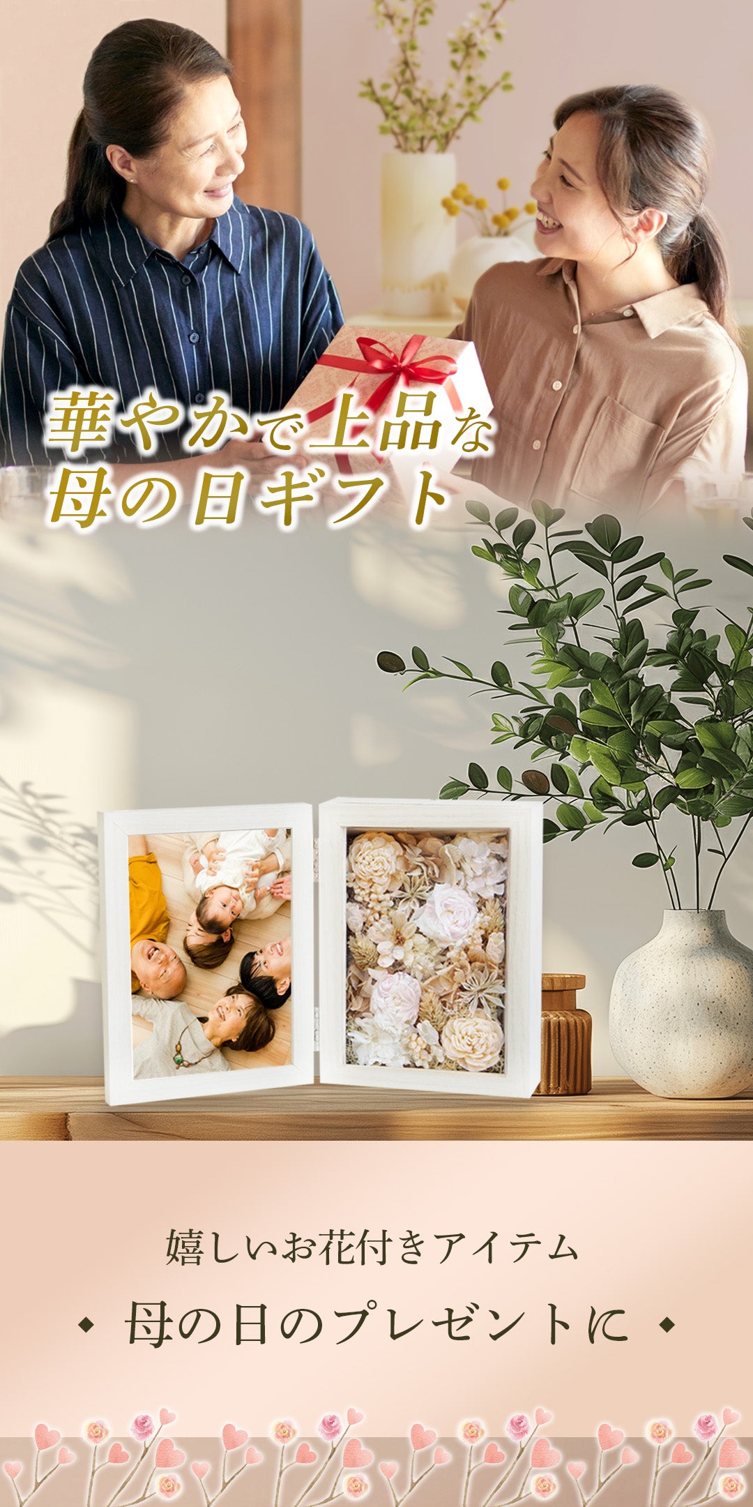 自然素材を使用したナチュラルなデザインで、日頃の感謝の気持ちを込めたお写真とフラワーのギフトは母の日にぴったりです!