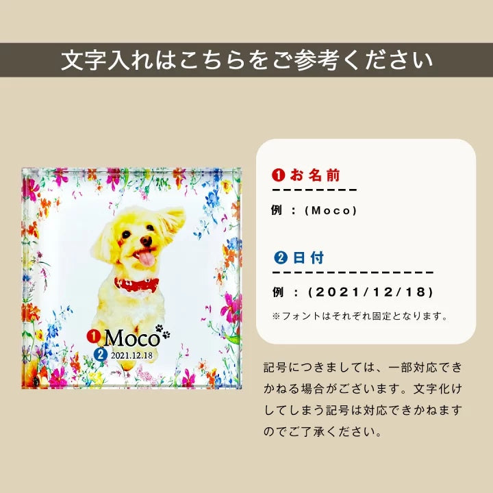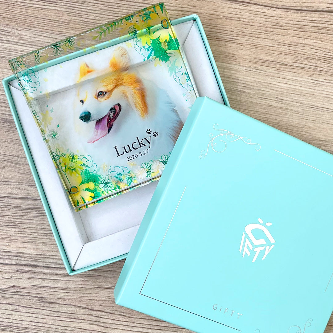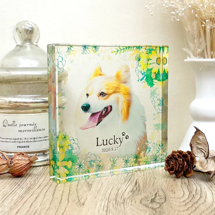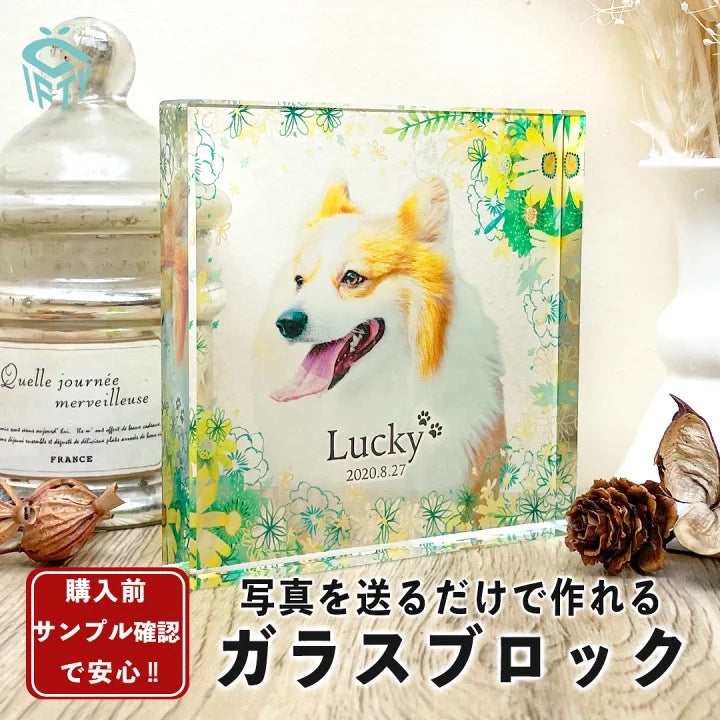 ペットのお写真1枚とメッセージを組み合わせて作れるガラスブロック。