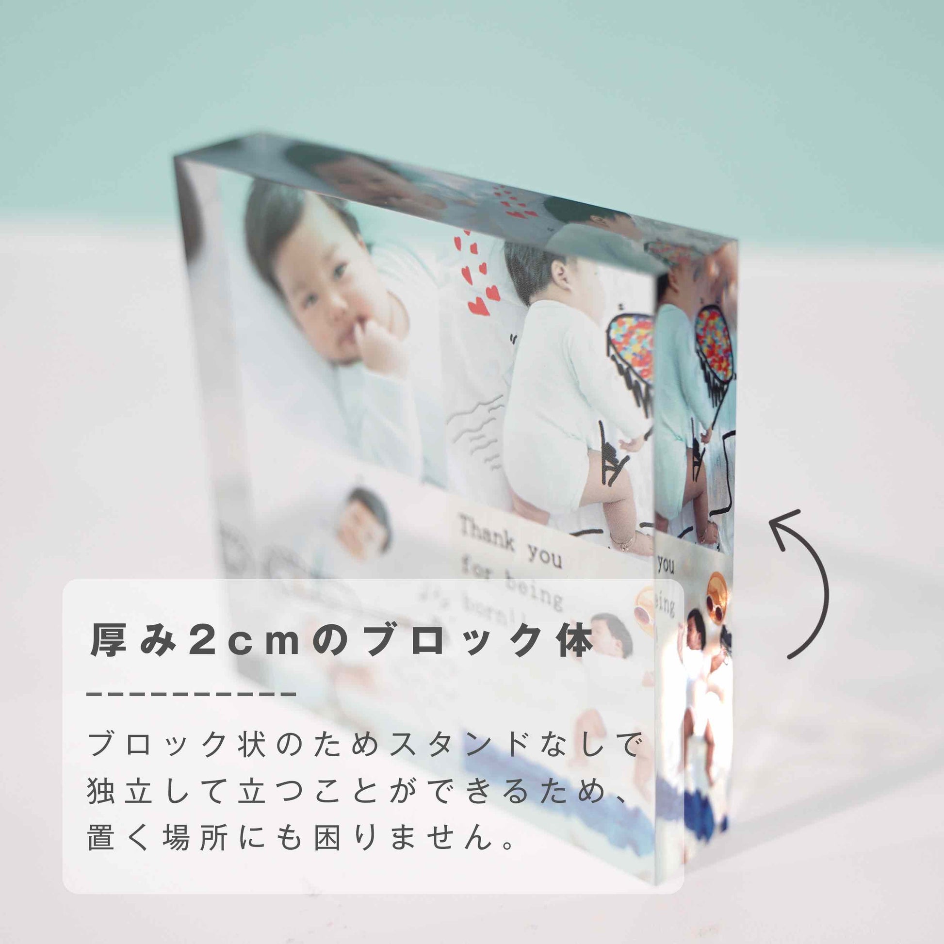 奥行きのある立体的なブロックに、アクリルの透明感を生かすため半透明で印刷することでまるでアクリルの中に写真があるような特別な存在感を演出してくれる商品です。