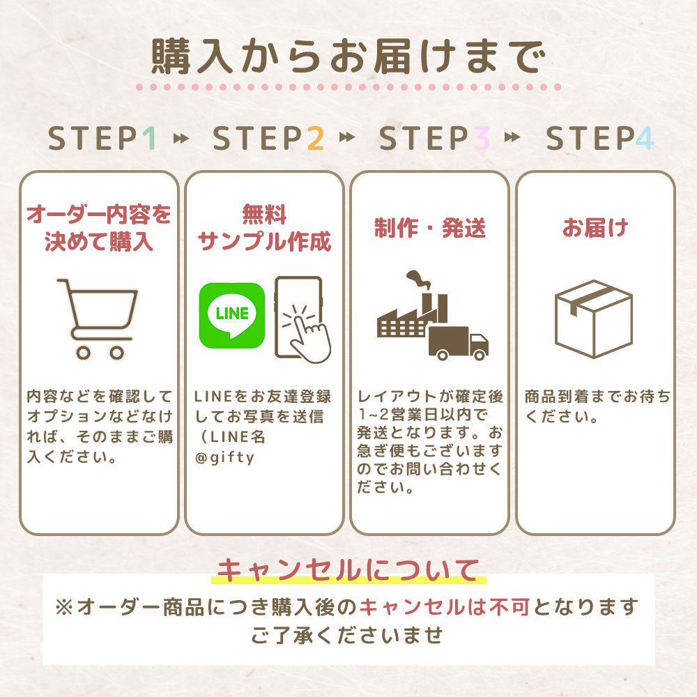 注文完了いたしましたら、LINEに注文番号、または購入者様のお名前をお送りください。支払い確認でき次第作成に移らせていただきます。