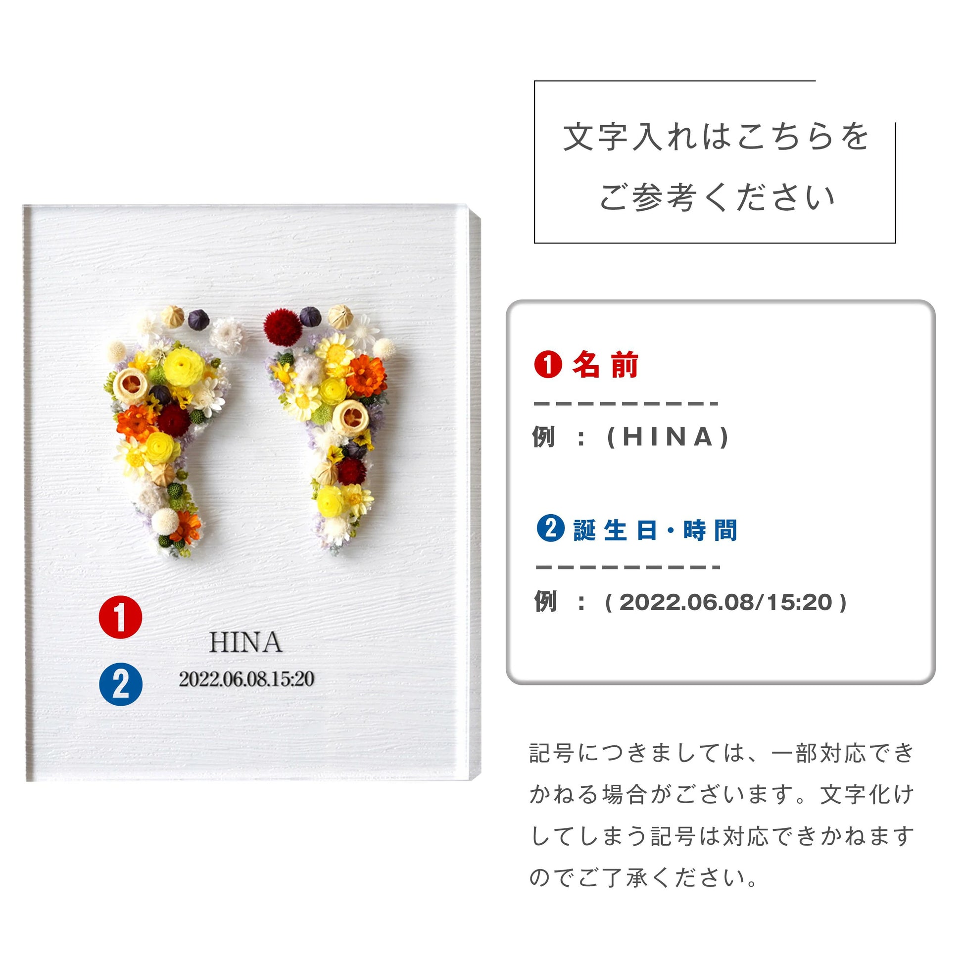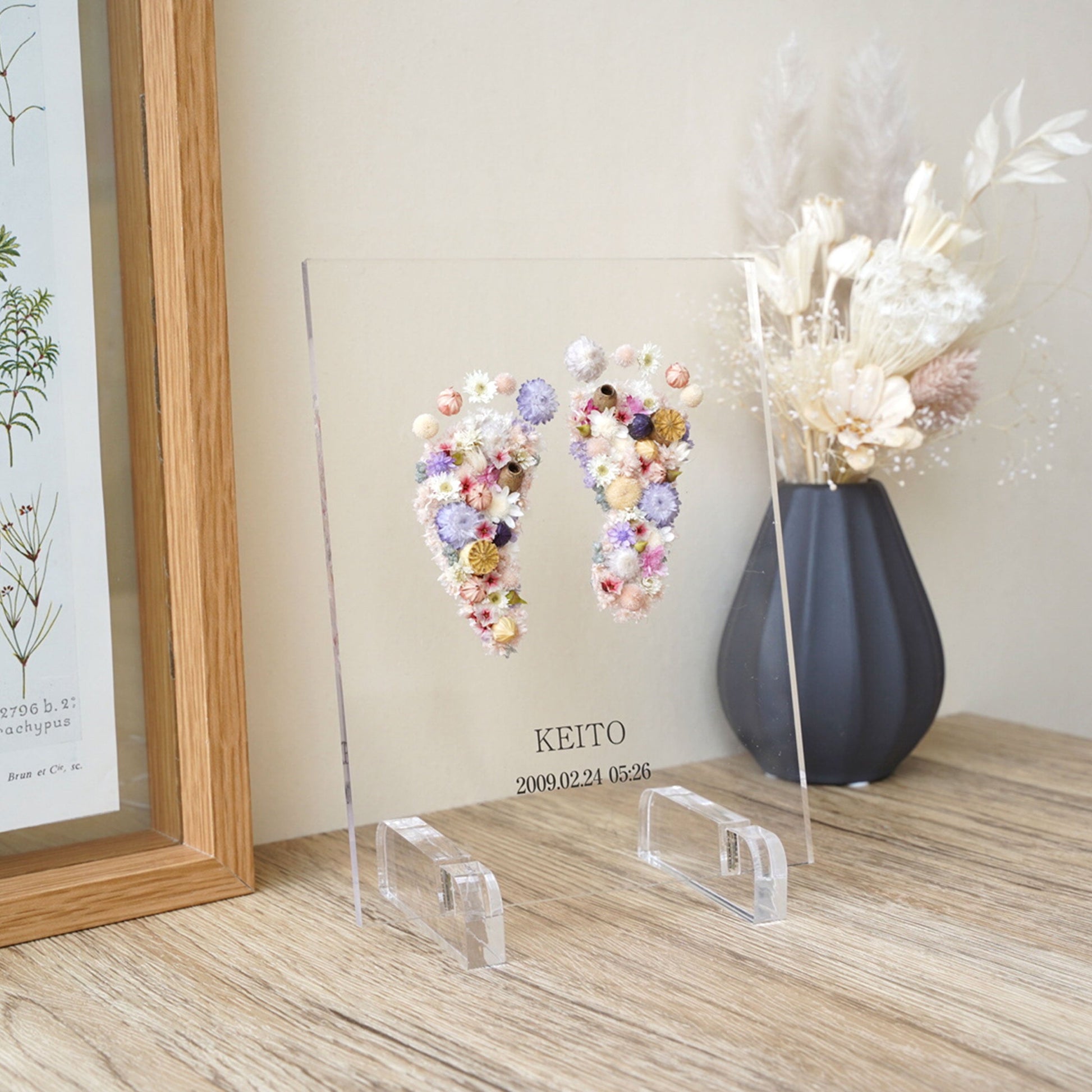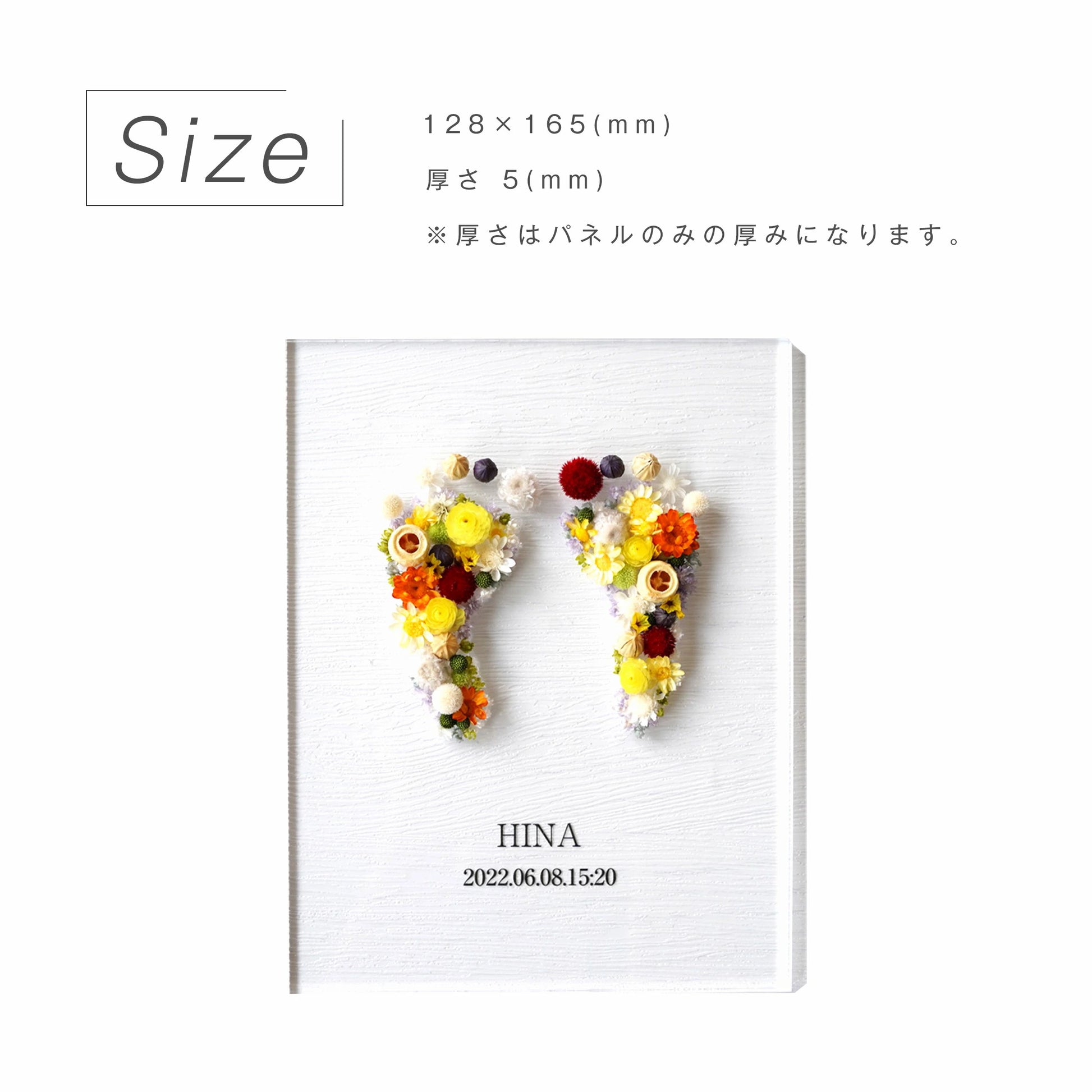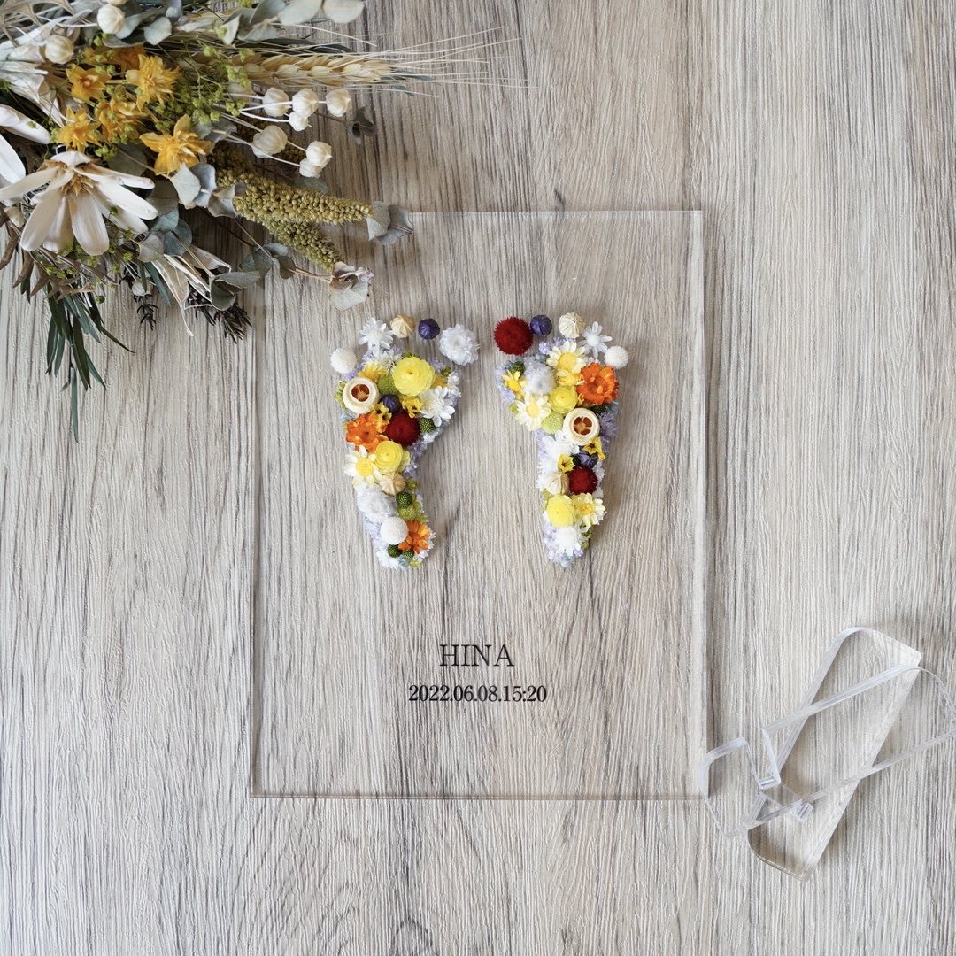 実物大のお子様の足型を、ドライフラワーやプリザーブドフラワーで型を取った世界に一つだけのアートです。