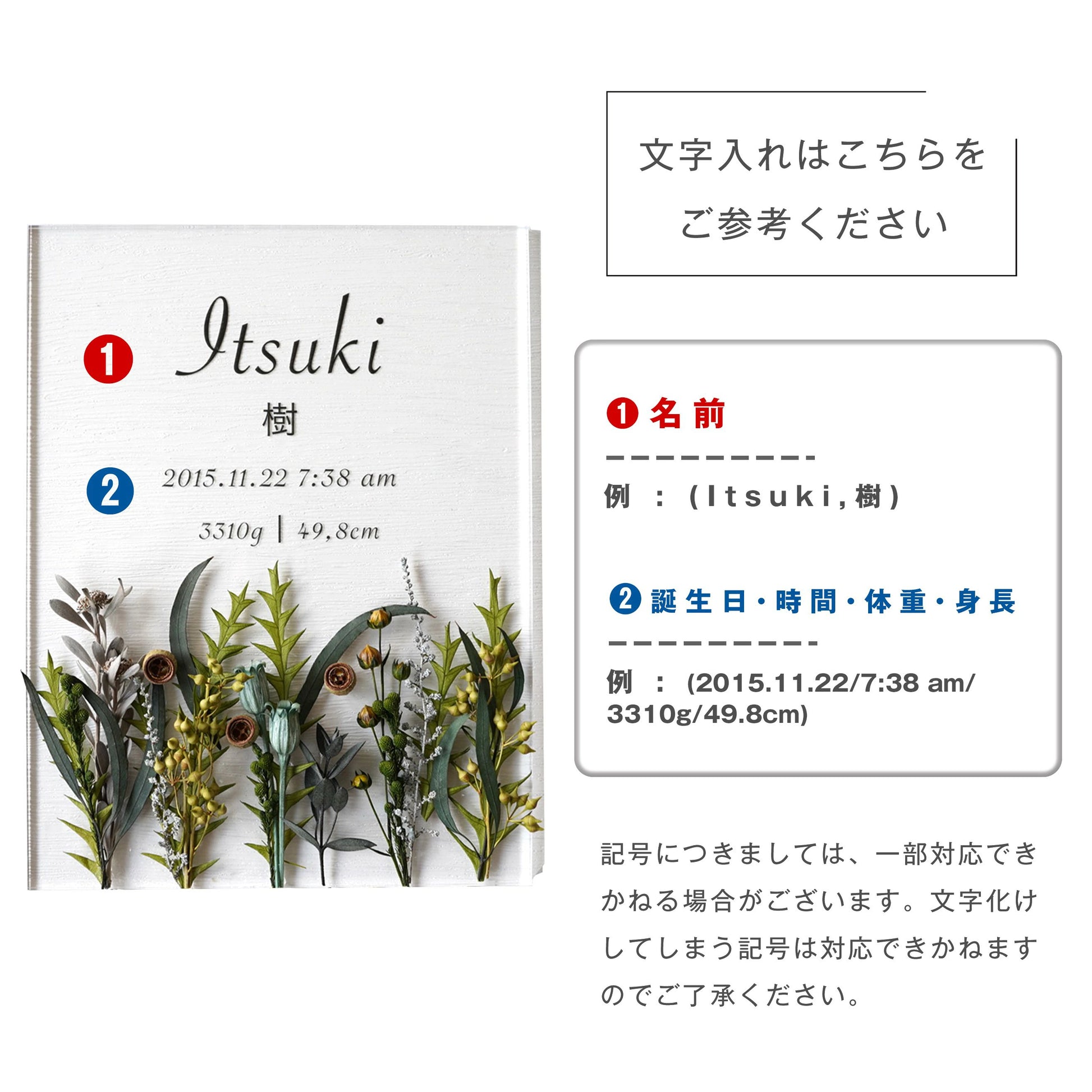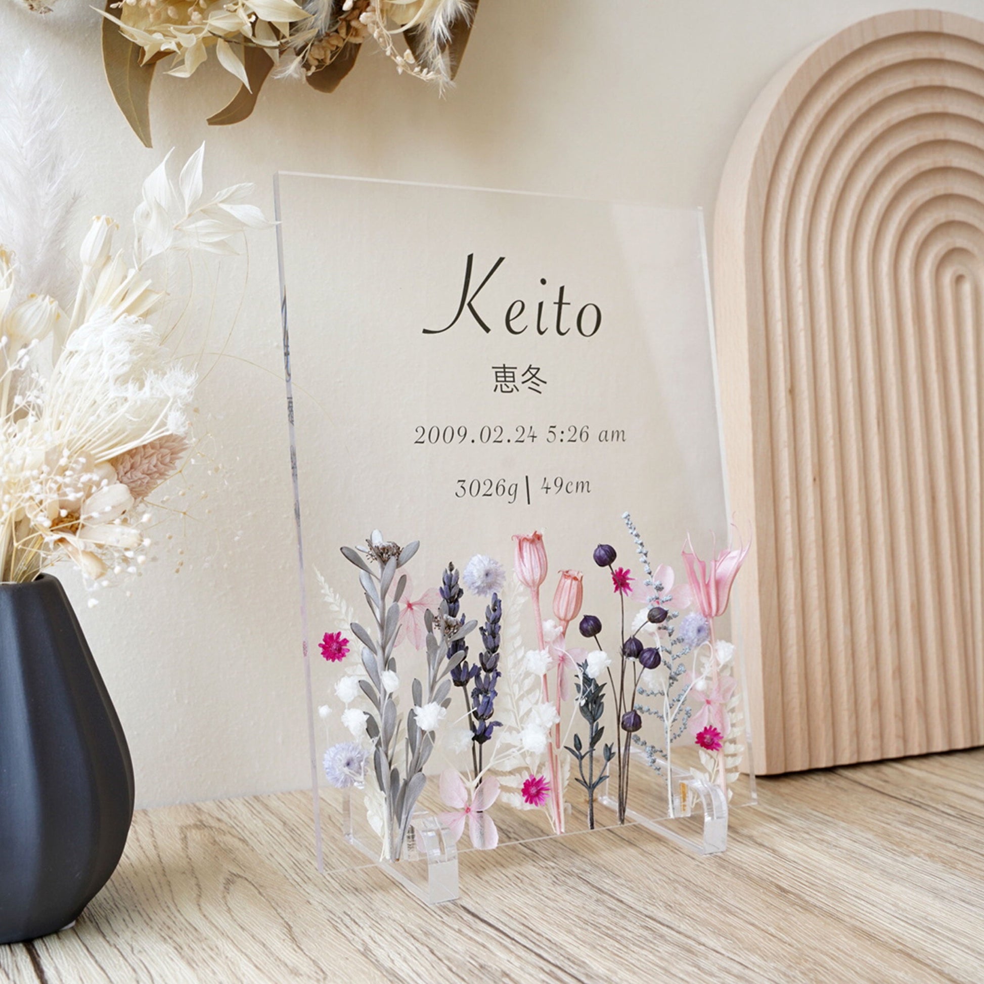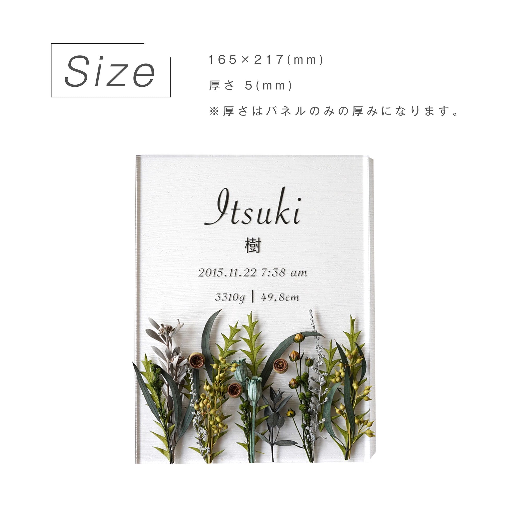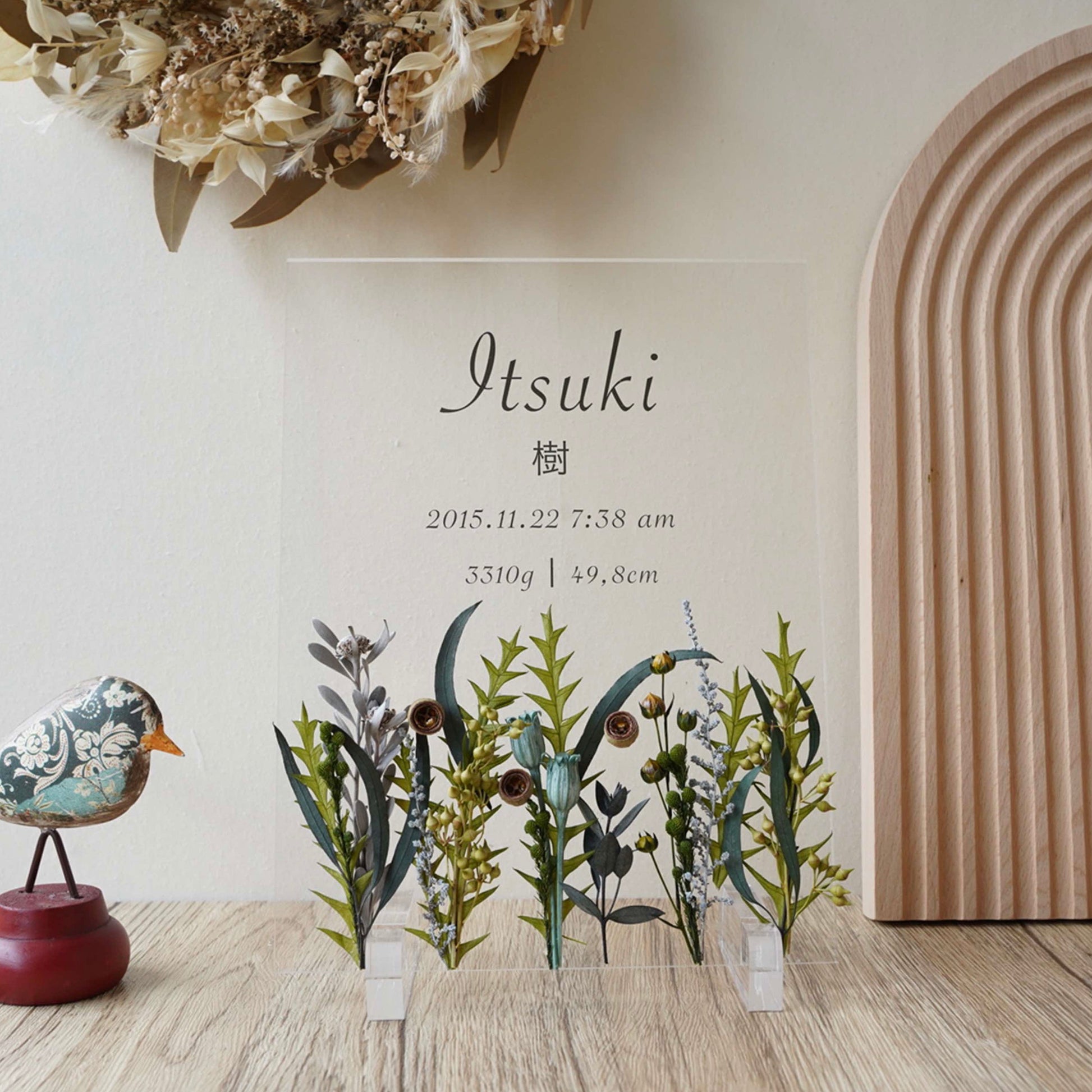 お子様が植物の様にすくすくと育っていく姿をイメージしてドライフラワーとプリザーブドフラワーでデザインした命名書です。