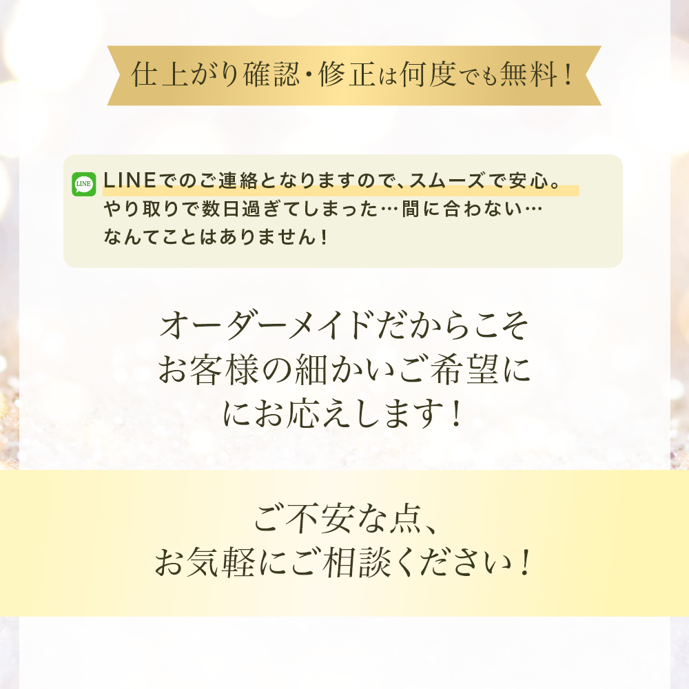 LINEの画面にサンプル作成に際し、オーダーシートと写真をお送りください。スタッフ確認次第サンプルを作成させていただきます。