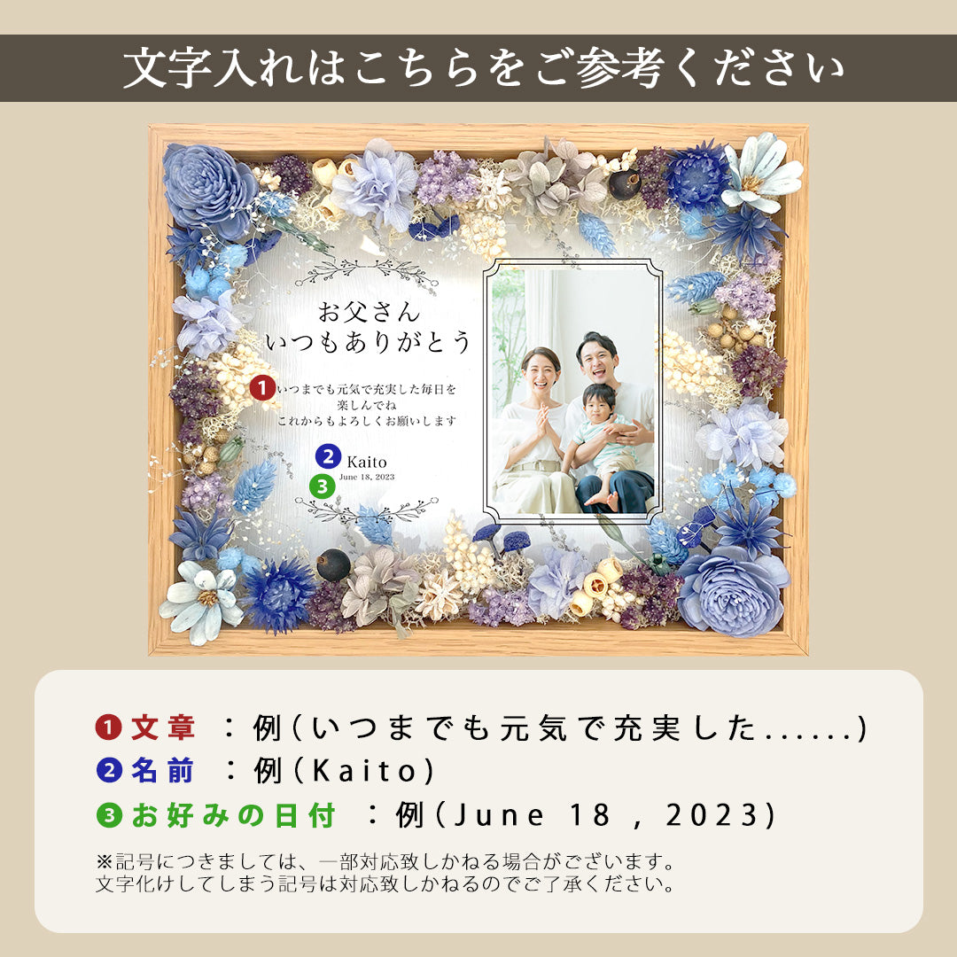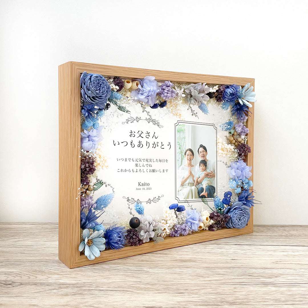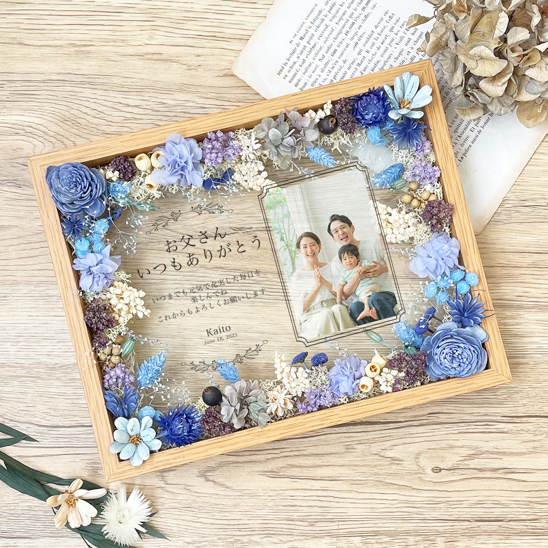 【デザイン】 2種デザインご用意しております。完全オーダーデザインも可能です。・厚みがあるフレームなので自立することができます。 ・後ろに壁掛け用の金具も付いているので壁に飾ることもできます。注意事項自然素材を使用しているためや葉の形により全く同じ形の物にはなりません。花材は仕入れの状況により異なるものを使用する場合があります。あるため配送中に多少欠けてしまう事がございます。経年により花材の色が徐々に変わっていきます。2枚のガラスをスライドして引き出す事のできるフレームです。 1枚のガラスに装飾し2枚目のガラスは引き出し可能ですが印刷部分が減ってしまう恐れがありますので引き出される際は十分にご注意ください。貼ってます。 湿度の高い場所で保管すると印刷部分が浮いてくることがあります。 保管場所にもご注意ください。