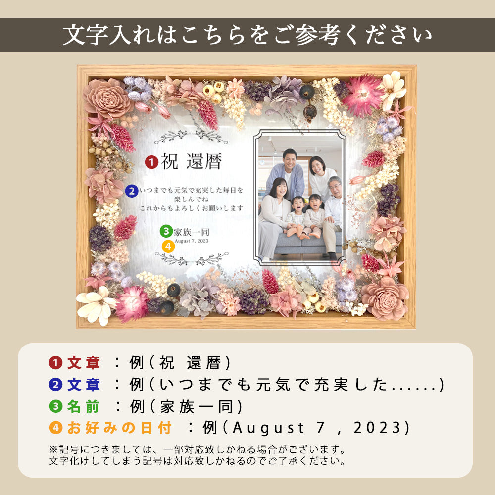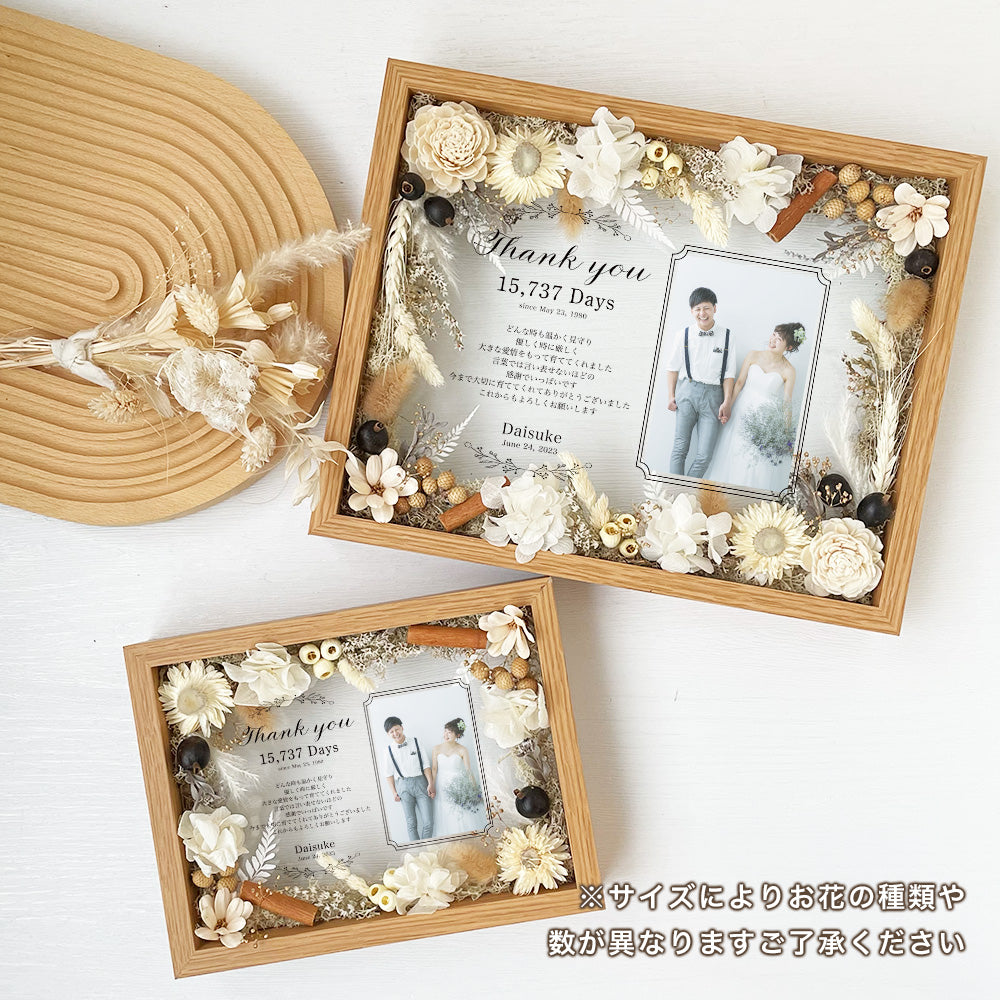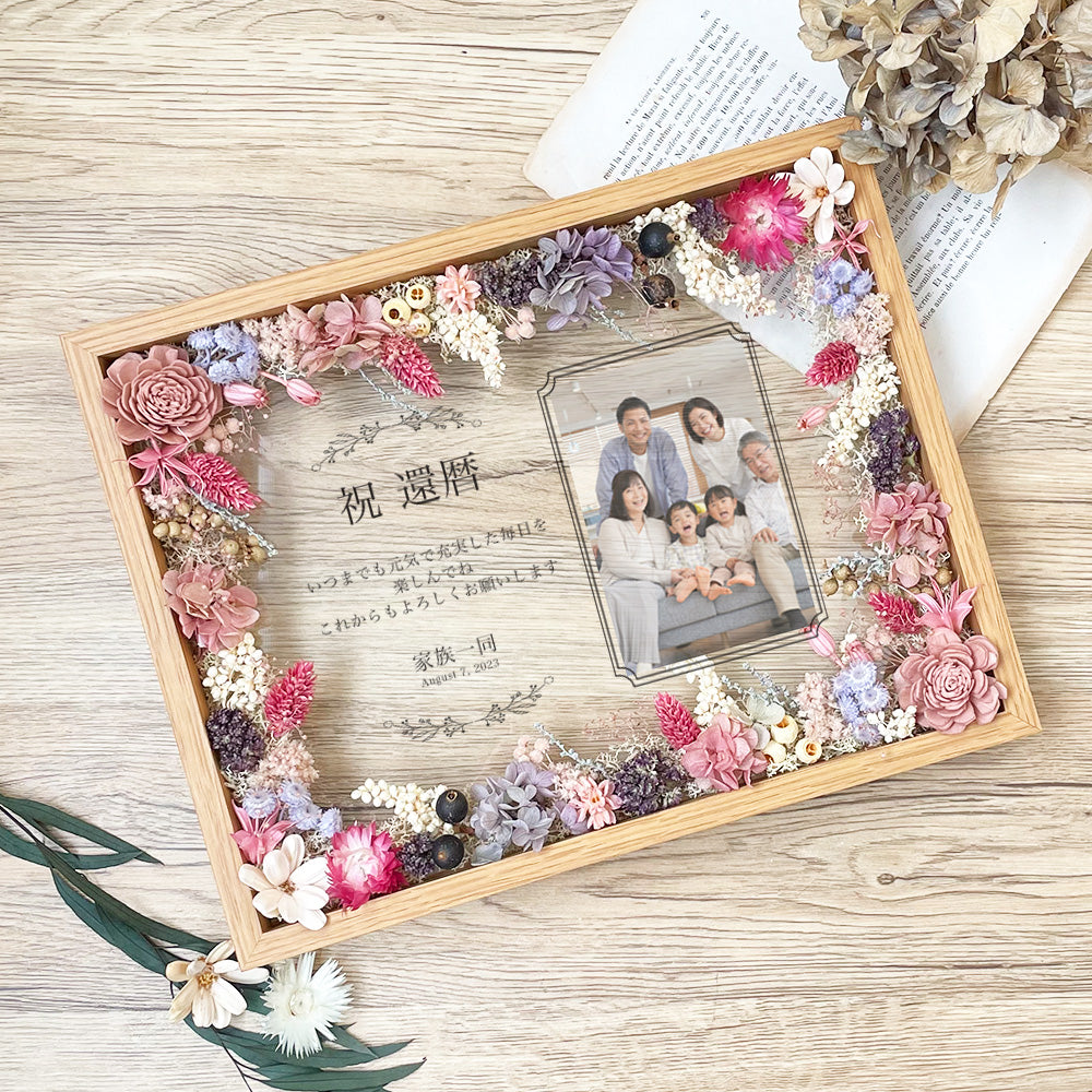【デザイン】 2種デザインご用意しております。完全オーダーデザインも可能です。フレームがあるので自立することができます。 ・後ろに壁掛け用の金具も付いているので壁に飾ることもできます。物にはなりません。花材は仕入れの状況により異なるものを使用する場合があります。あるため配送中に多少欠けてしまう事がございます。経年により花材の色が徐々に変わっていきます2枚のガラスをスライドして引き出す事のできるフレームです。 1枚のガラスに装飾し2枚目のガラスは引き出し可能ですが印刷部分が減ってしまう恐れがありますので引き出される際は十分にご注意ください。 湿度の高い場所で保管すると印刷部分が浮いてくることがあります。 保管場所にもご注意ください。