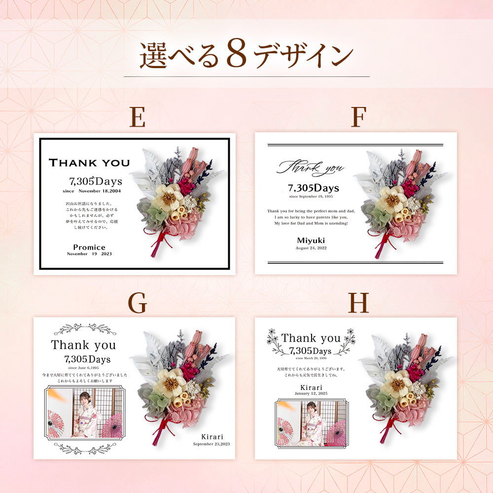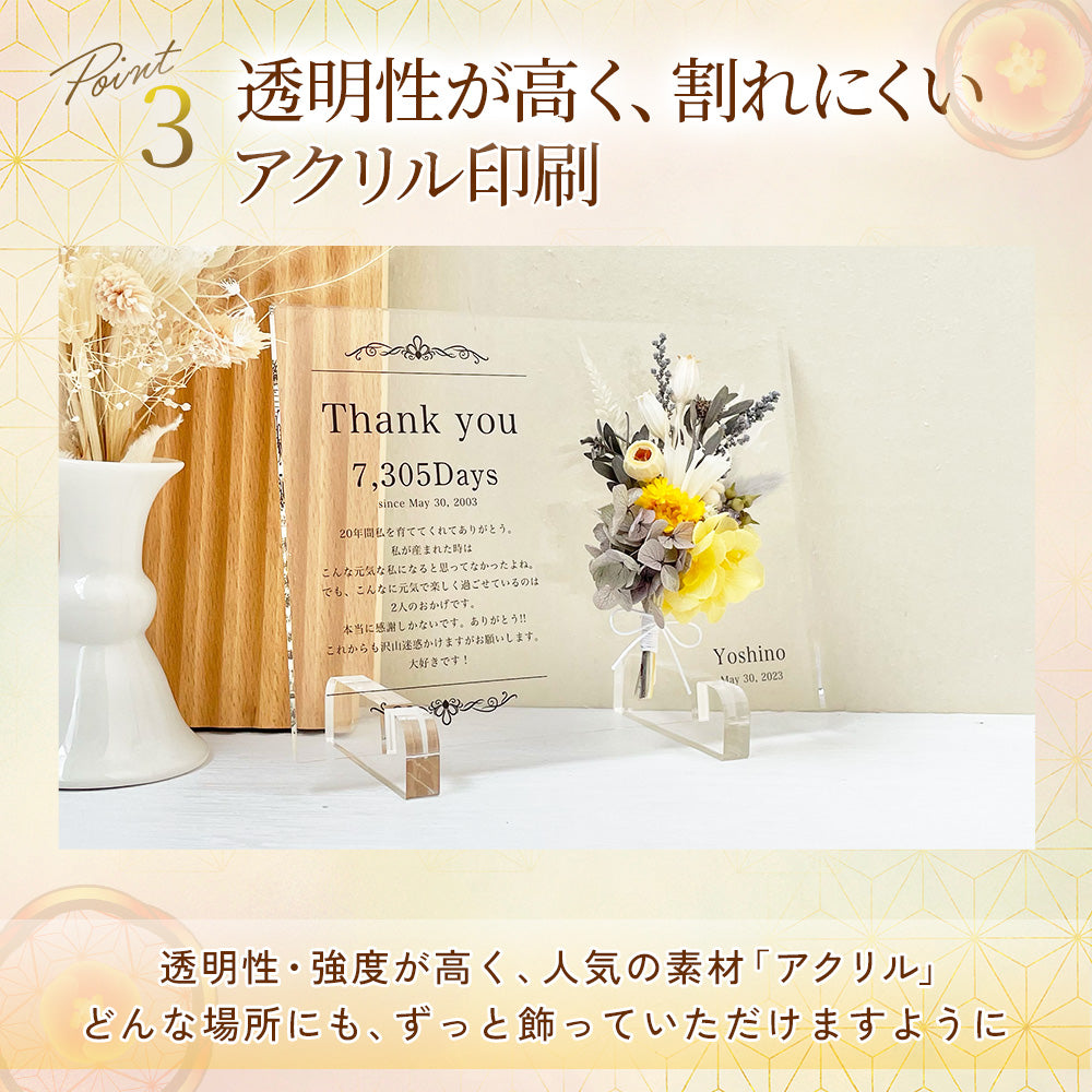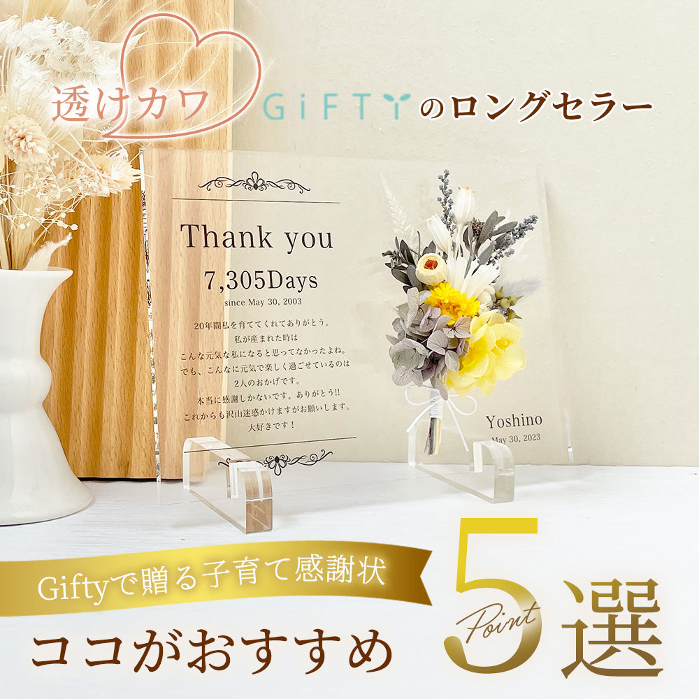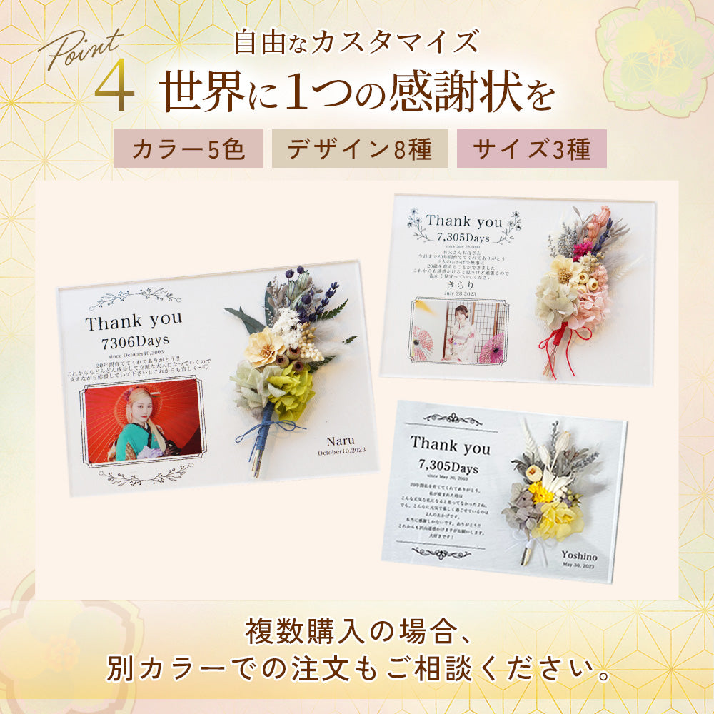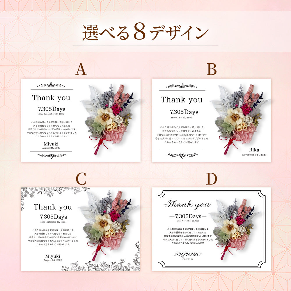 プリザーブドフラワーの花束をあしらった子育て感謝状です。