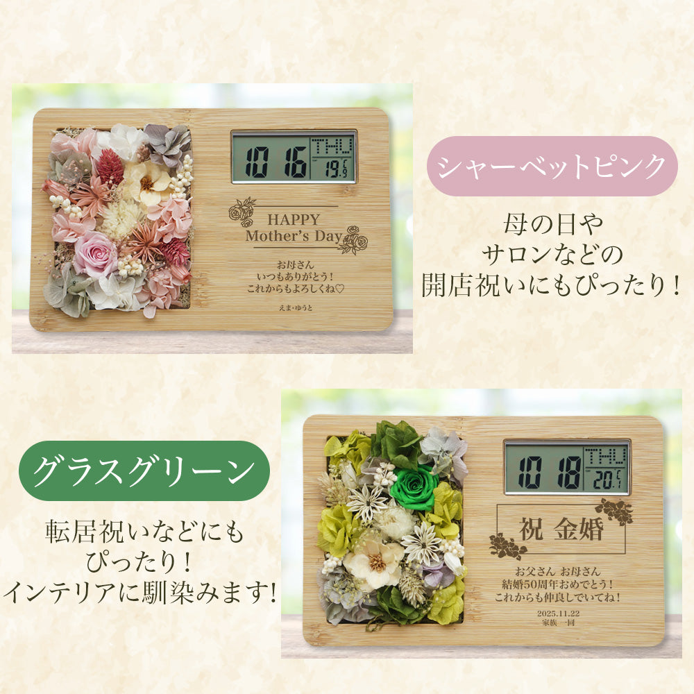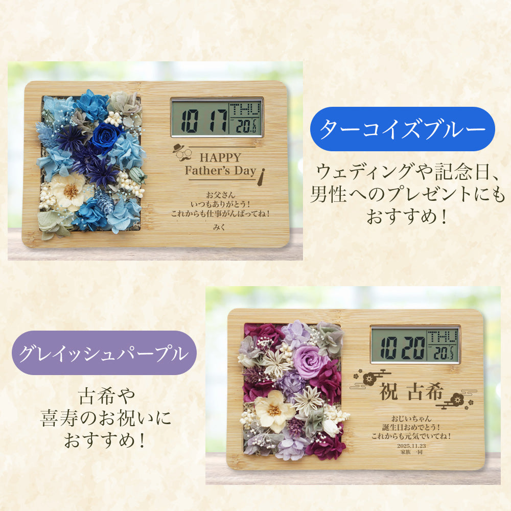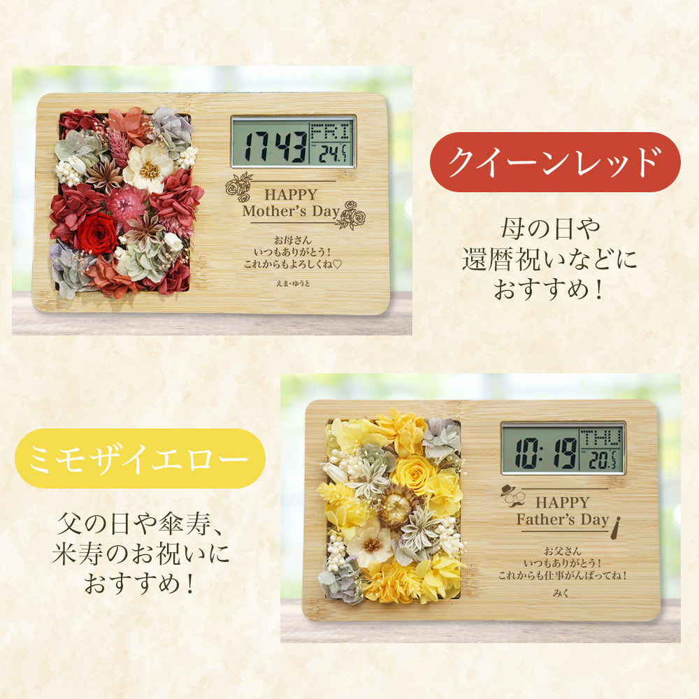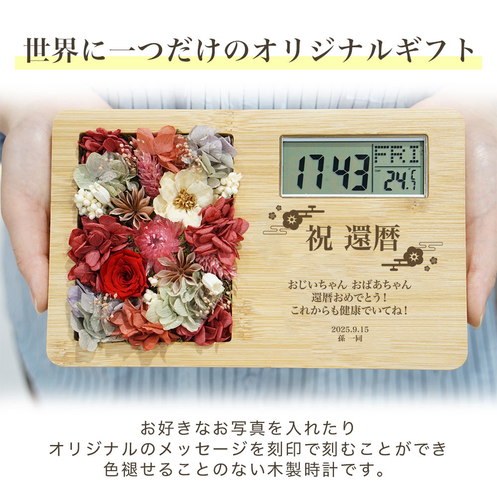 高品質な竹製の時計にお好きなメッセージを刻印し、写真やフラワーと合わせた世界に一つだけのオリジナル時計が作れます。また写真後いれも可能ですので、お好きなお写真を入れ替えてお楽しみもいただけます。