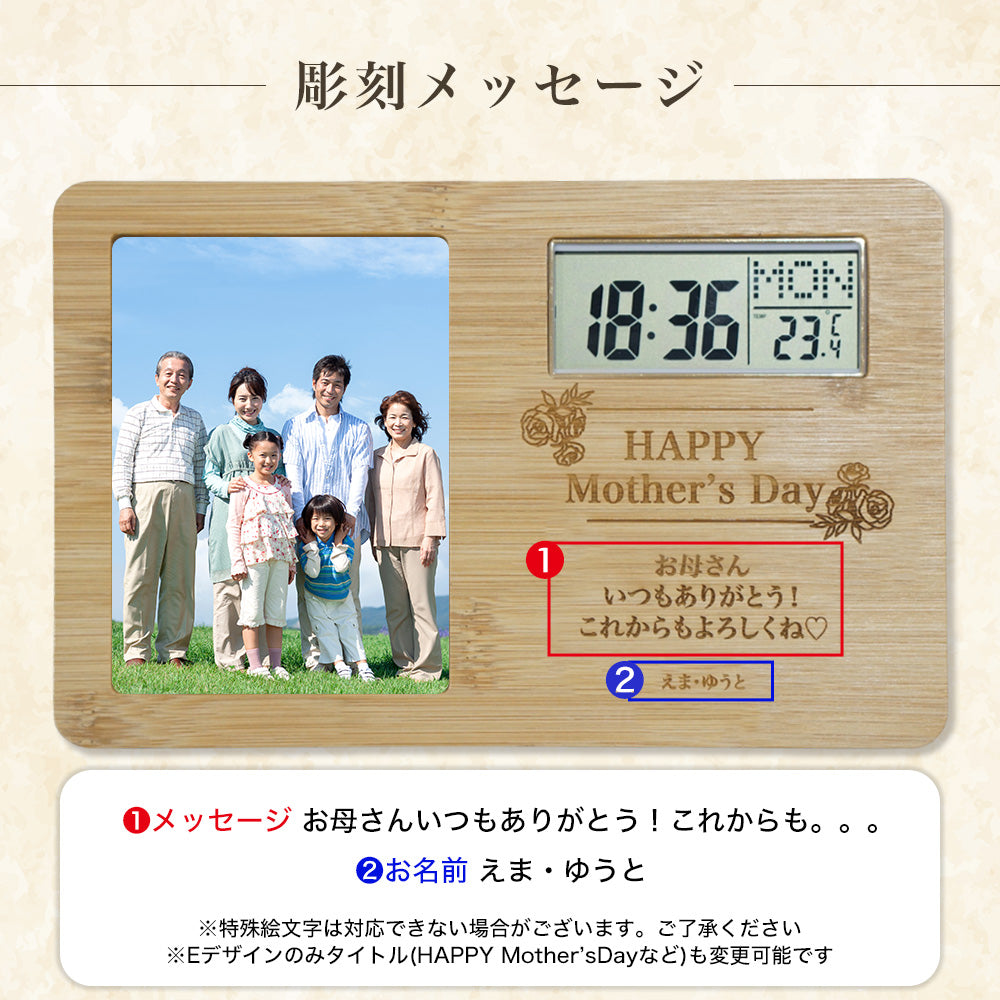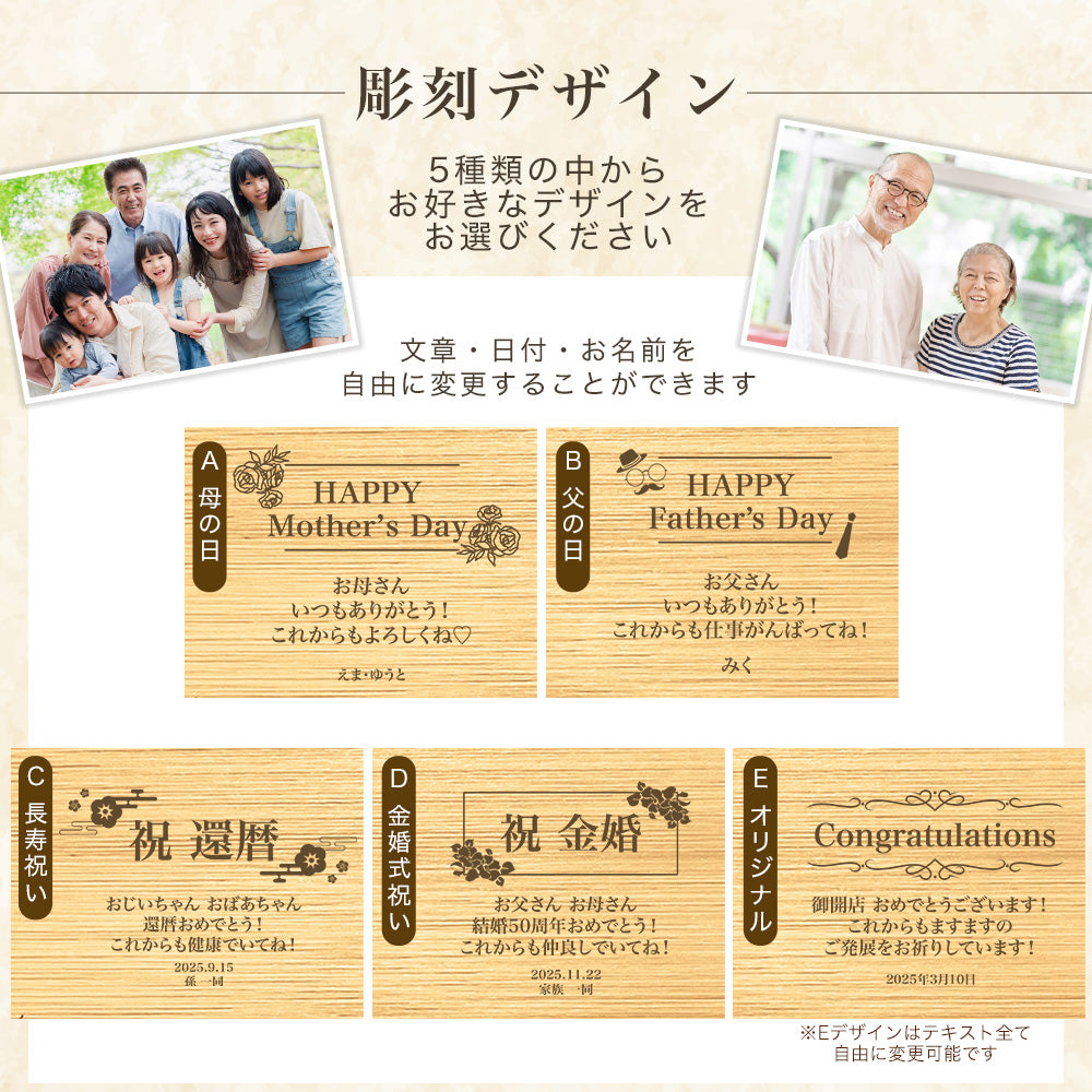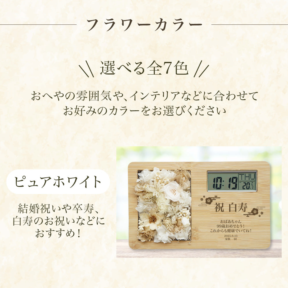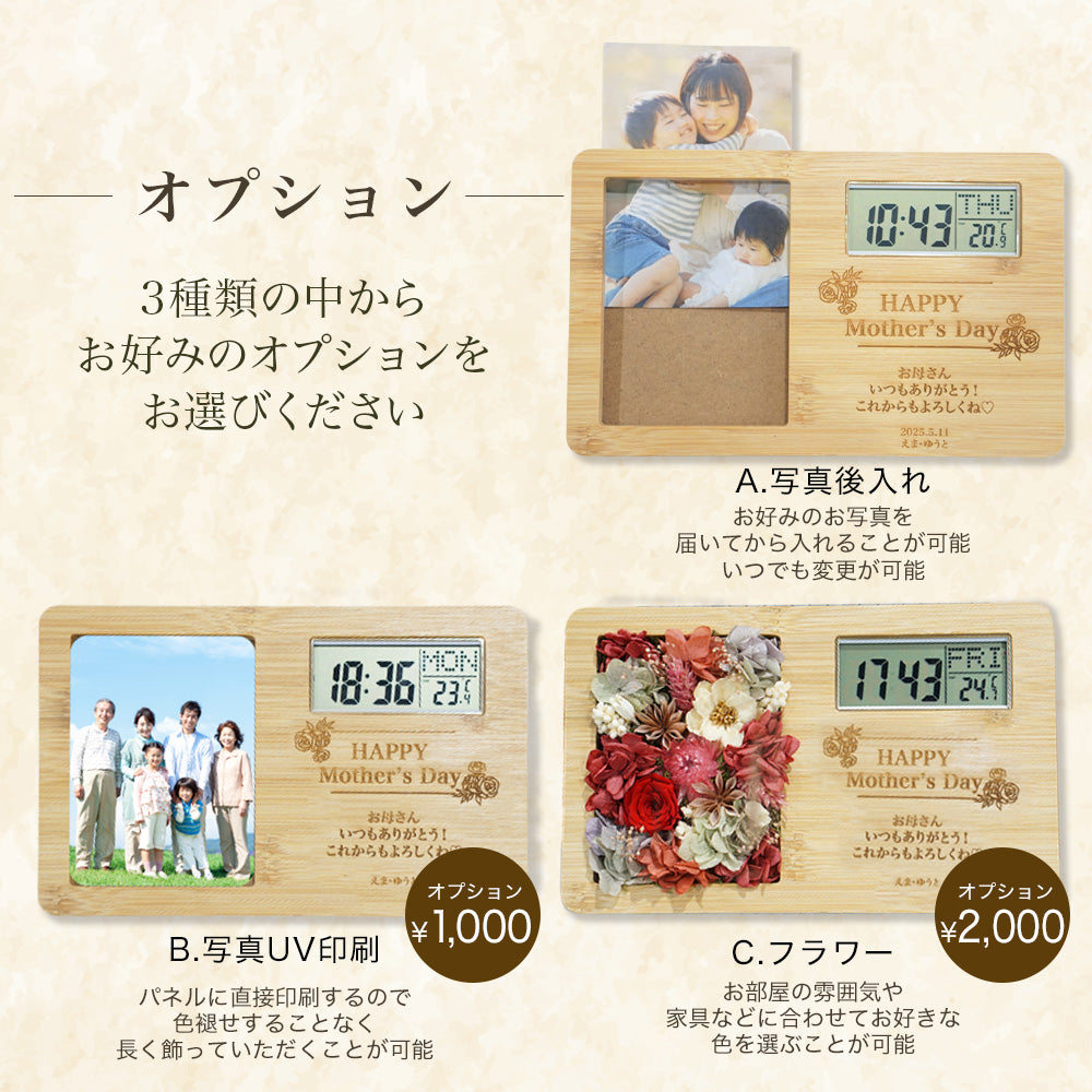 高品質な竹製の時計にお好きなメッセージを刻印し、写真やフラワーと合わせた世界に一つだけのオリジナル時計が作れます。また写真後いれも可能ですので、お好きなお写真を入れ替えてお楽しみもいただけます。